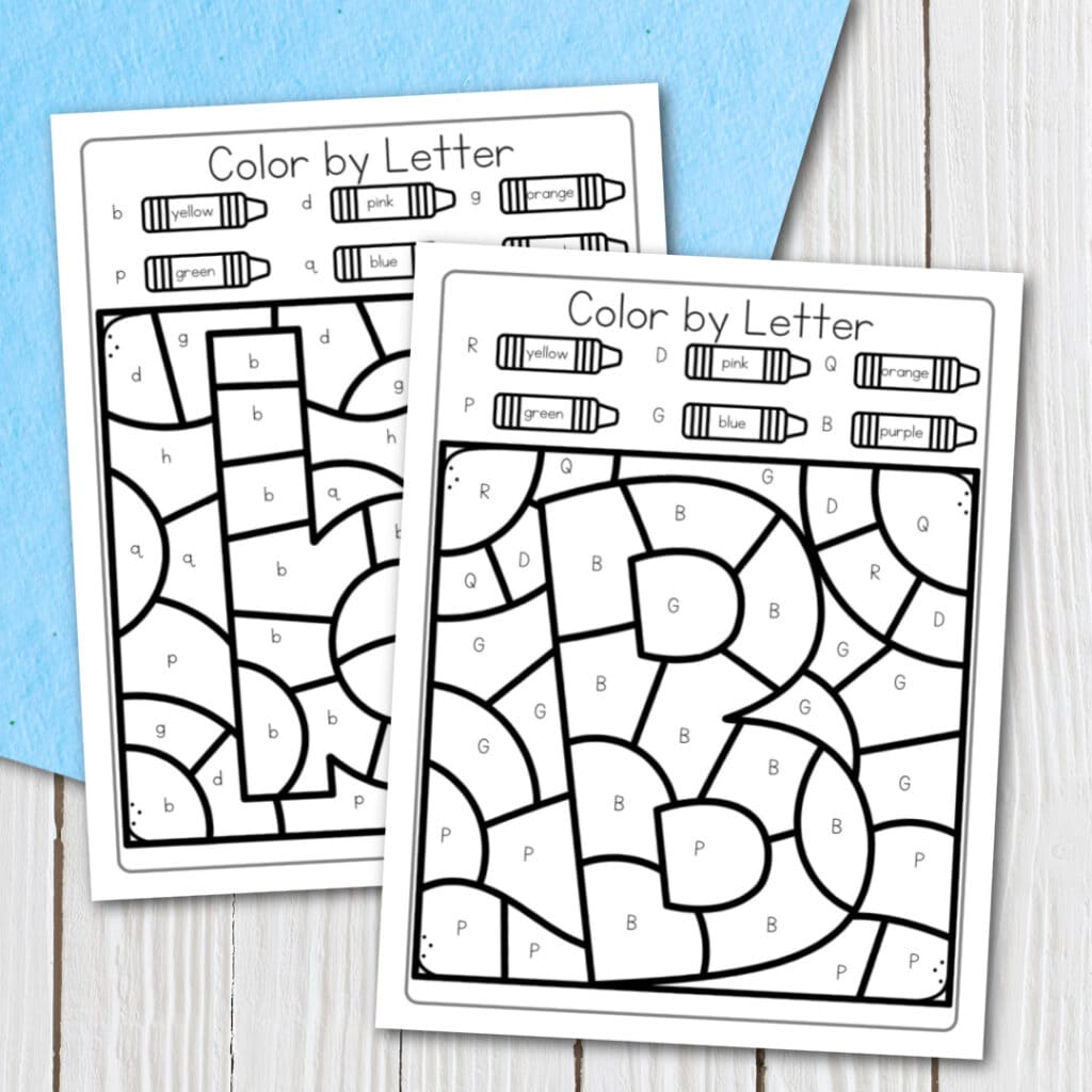 This free printable pack includes two color-by-letter activity pages. On each one, children will follow the color code to reveal the hidden images – an uppercase B and a lowercase b.