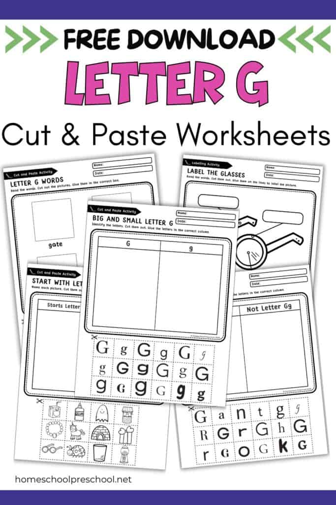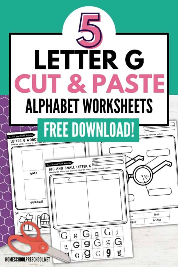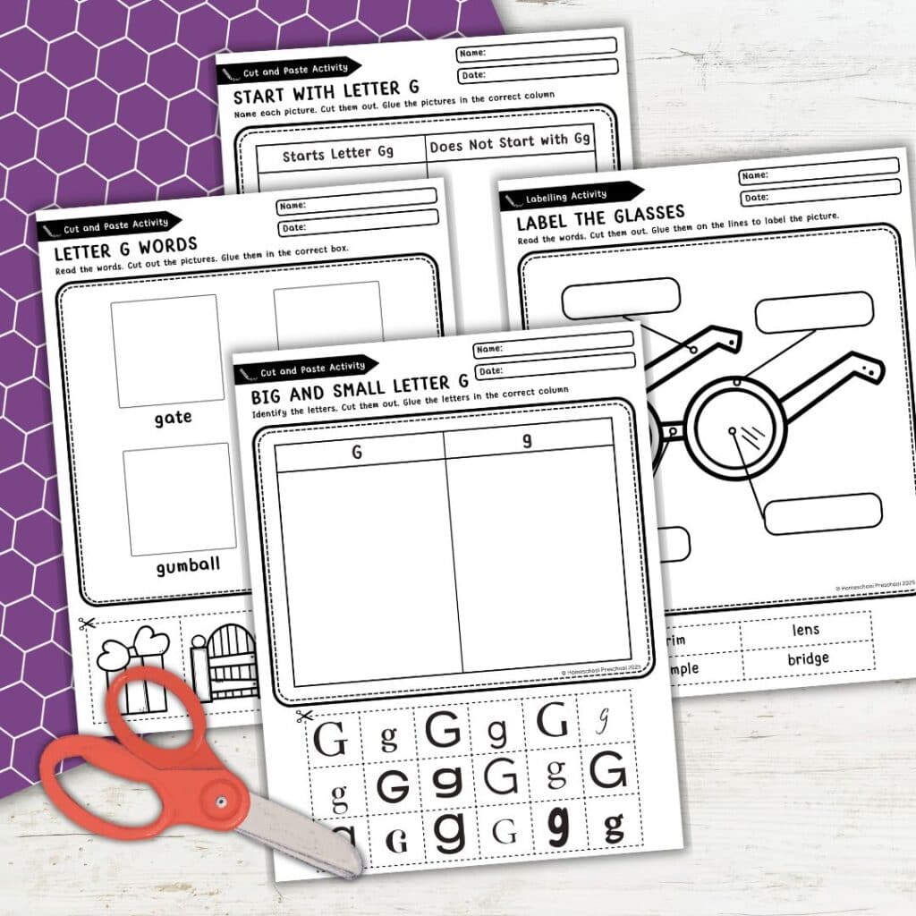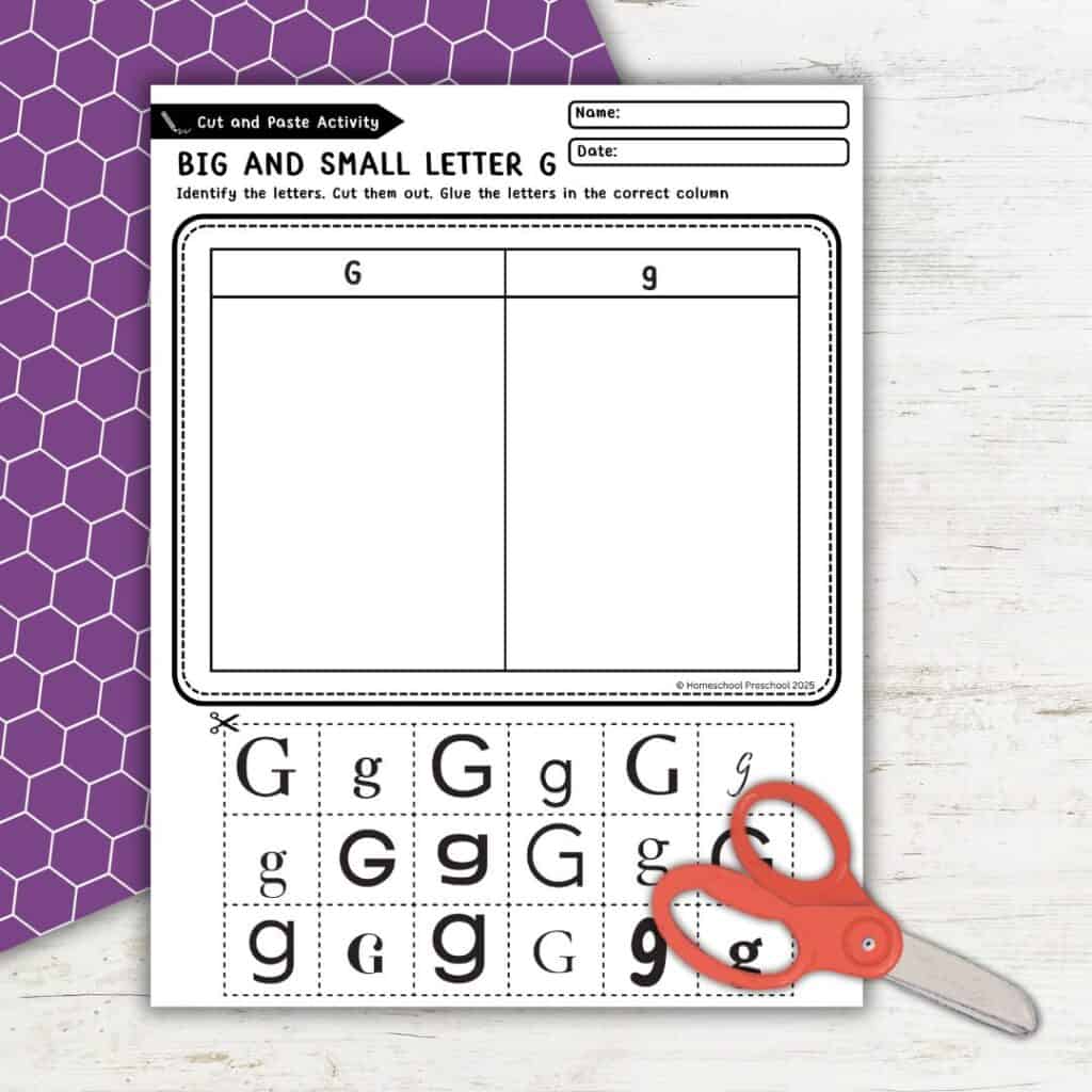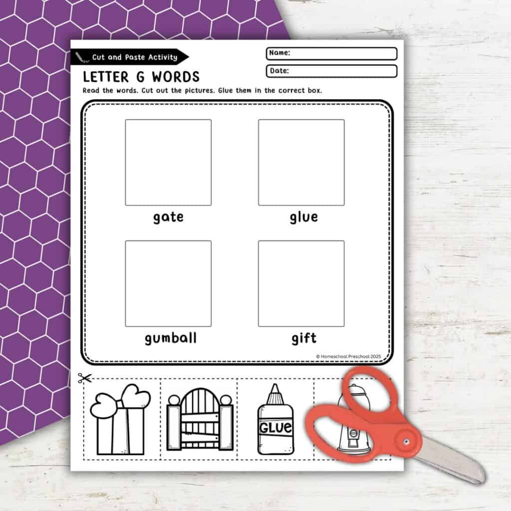 Kids can learn so much from this activity! They’ll practice recognizing both uppercase and lowercase G, sorting letters, and identifying words that begin with the letter G. As they cut and paste, they’ll also strengthen their fine motor skills and hand-eye coordination.