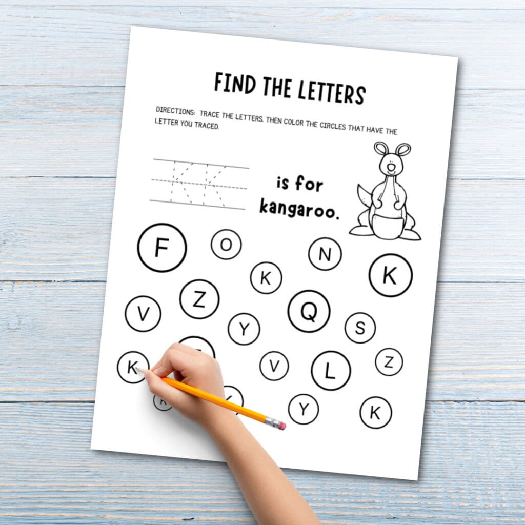 On the letter recognition page, kids will use a dot marker or crayon to fill in the circles containing the letter K.