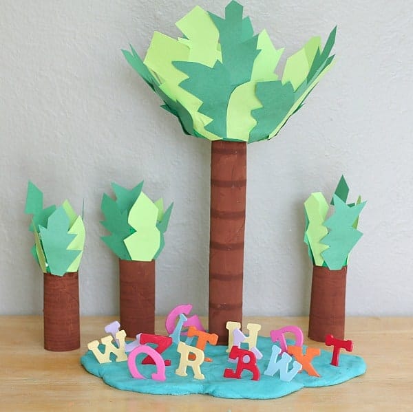 Kids can help you make this Chicka Chicka Boom Boom play set and then practice letter recognition as they add letter to the coconut tree.Â