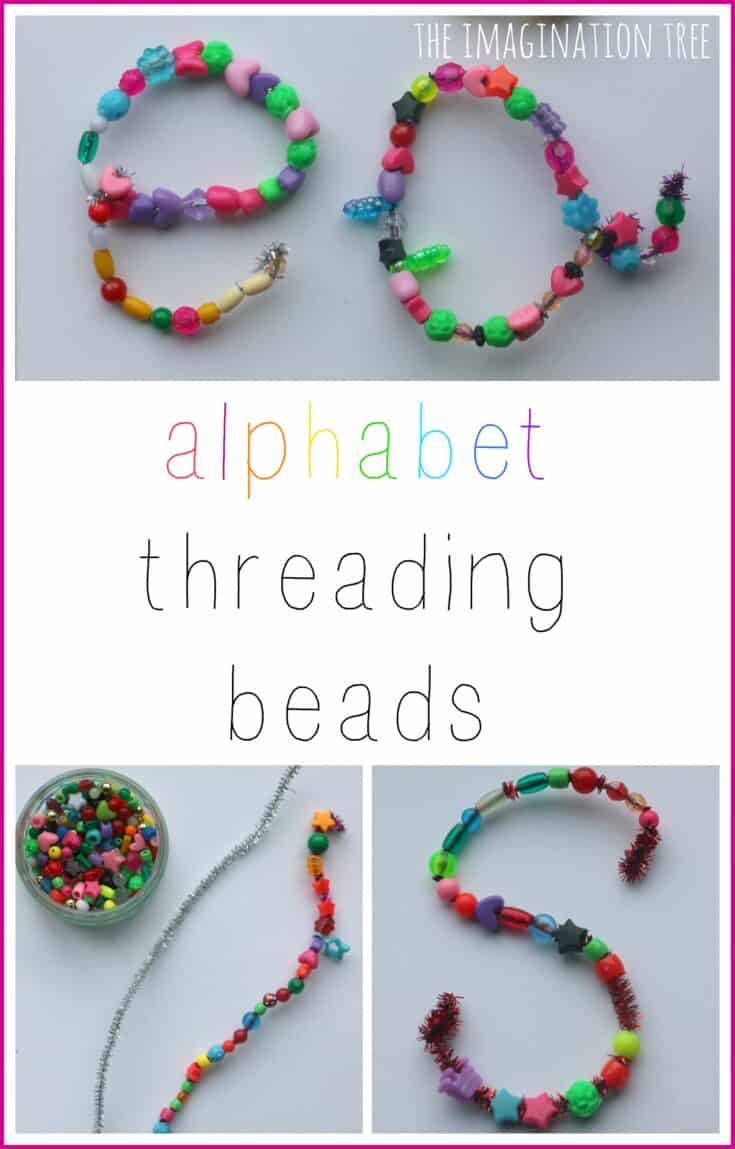 With some pipe cleaners and pony beads, your kids can work on fine motor skills while threading beads and forming the pipe cleaners into letters of the alphabet.Â