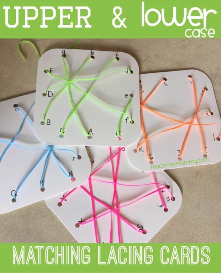 These uppercase and lowercase alphabet matching lacing cards will have your kids matching letters while building fine motor skills.Â