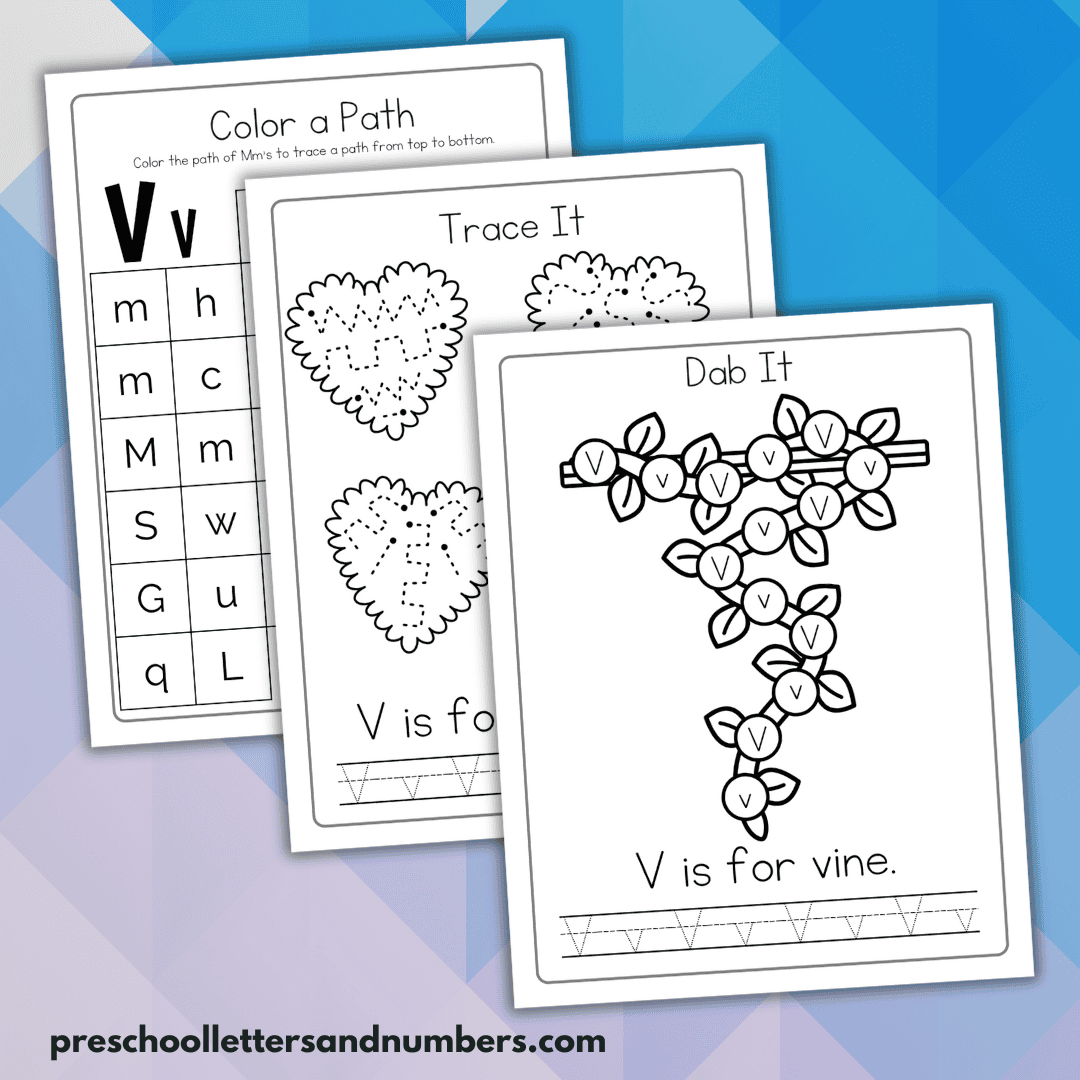 In this collection of letter tracing worksheets, you’ll receive eleven Letter Vv activity pages. These worksheets focus on the following skills:
