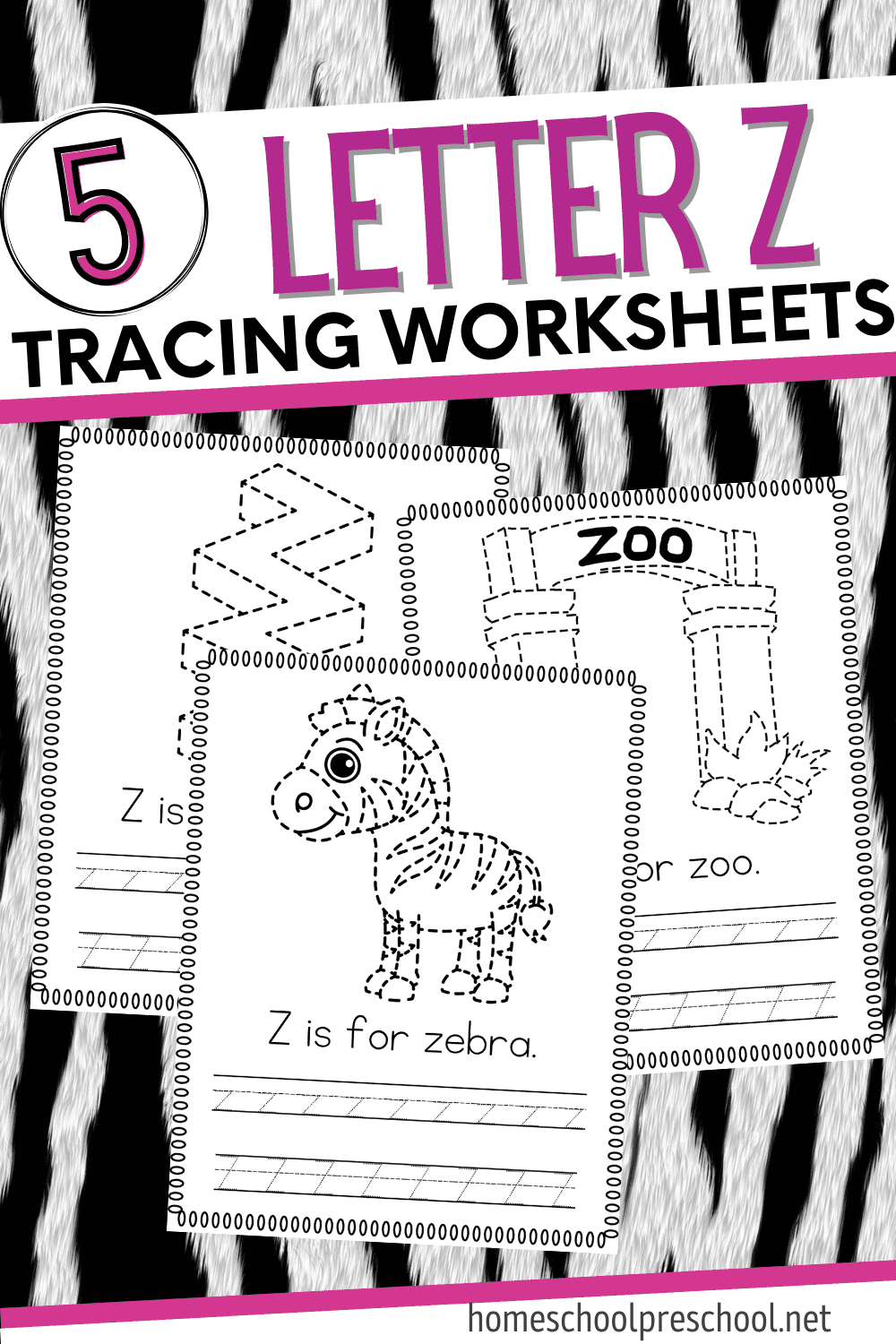 This free printable includes five Letter Zz tracing worksheets. They include the following Letter Zz words: