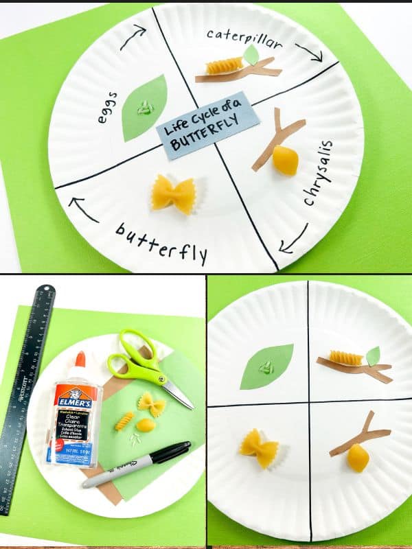 - Divide a paper plate into four sections and label them: egg, caterpillar, chrysalis, and butterfly.