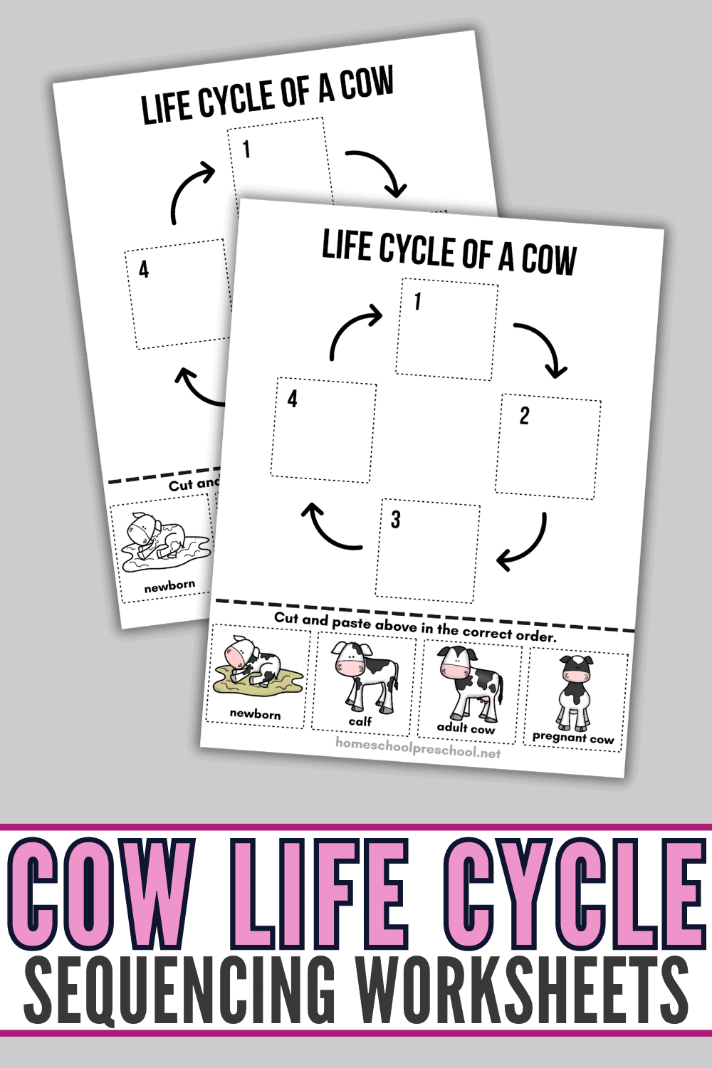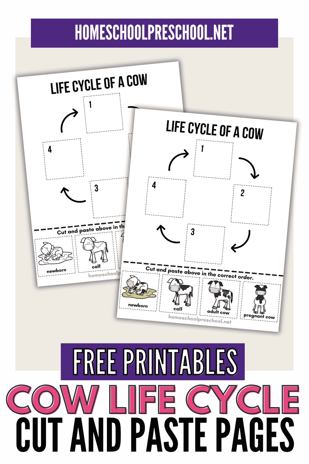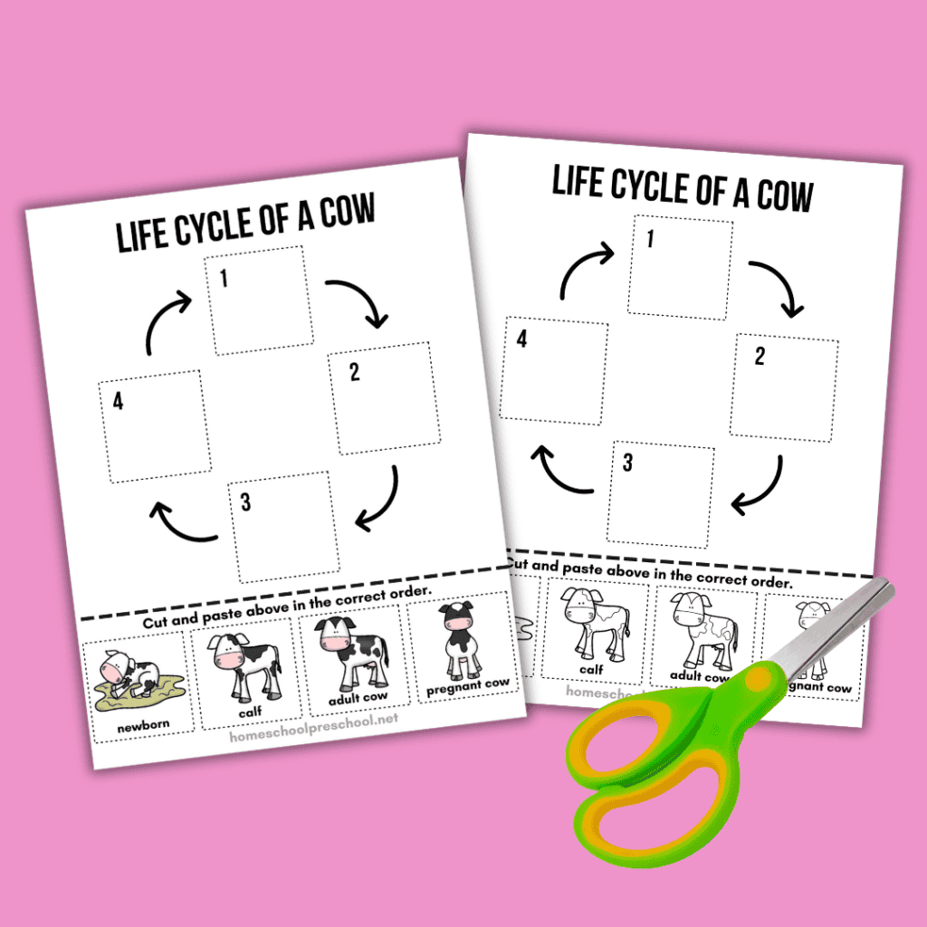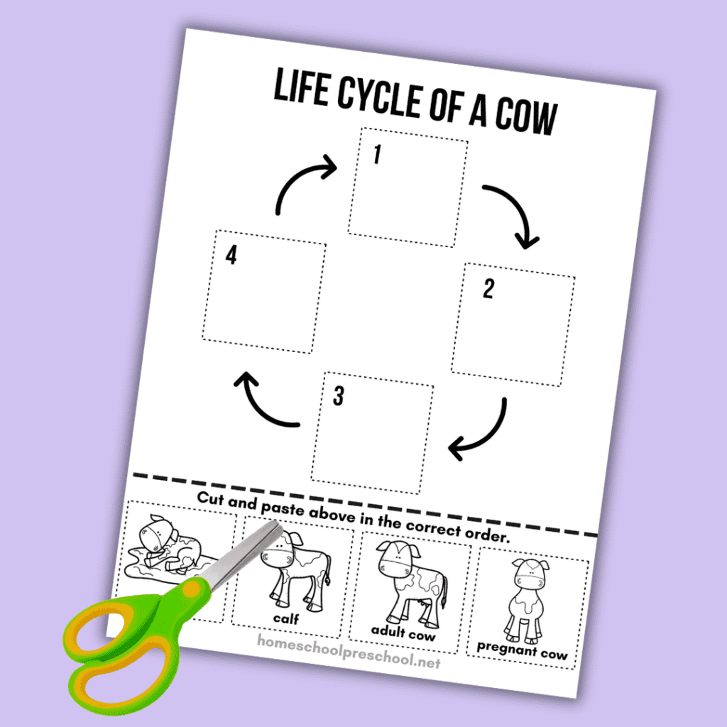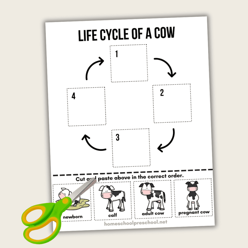 Our worksheet features pictures that children can cut out and paste in their proper order, creating a tactile learning experience that reinforces the cow’s life cycle stages.