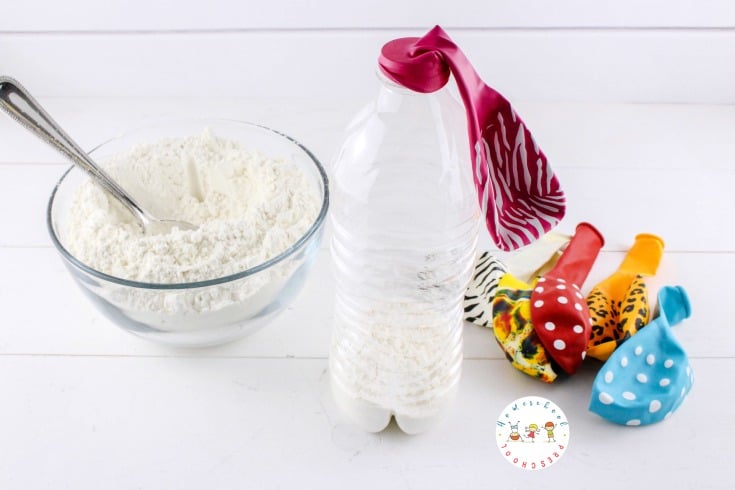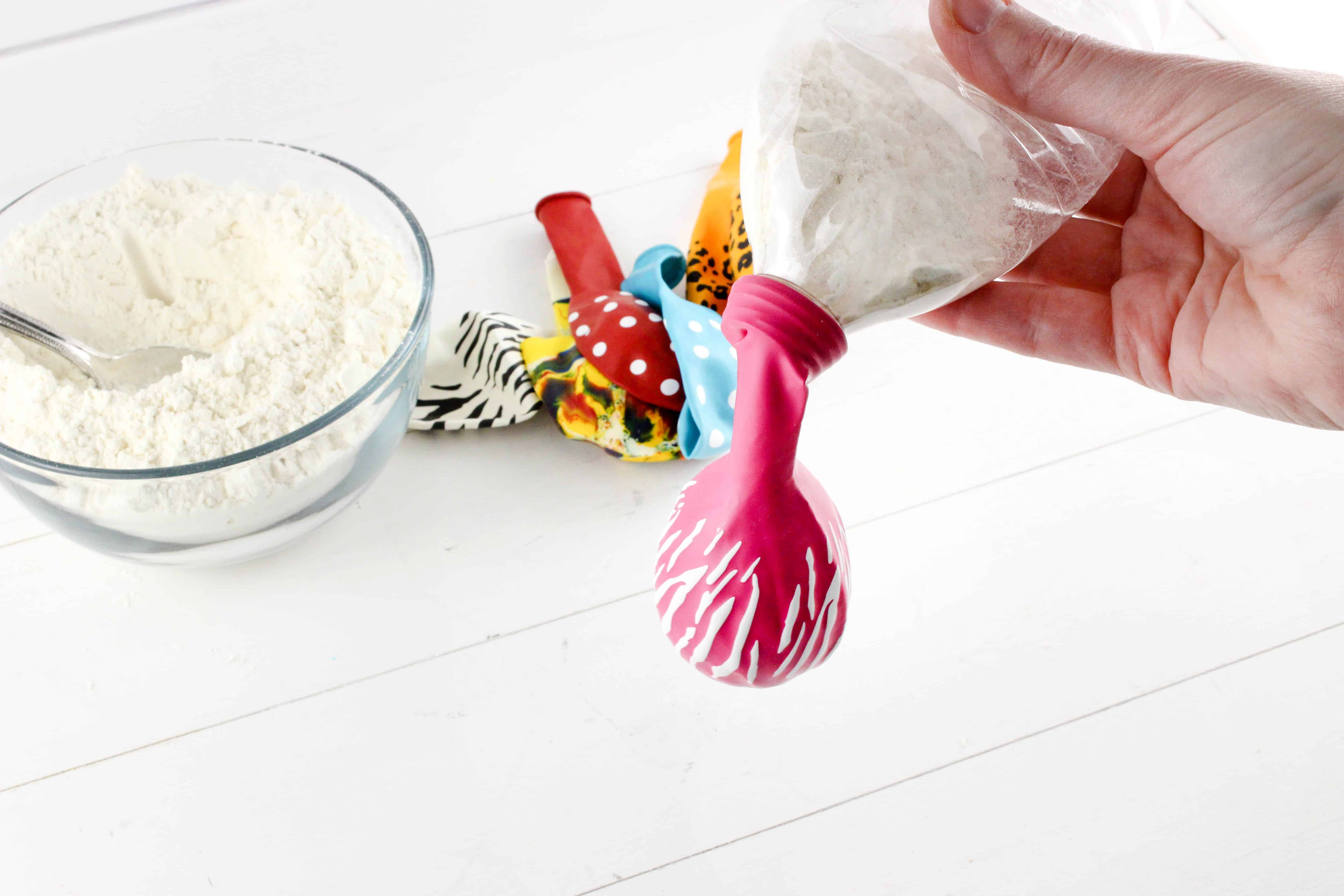 Once you’ve got all the flour in the balloon, pinch the balloon and release it from the bottle. Again, take care not to tear the neck of the balloon.