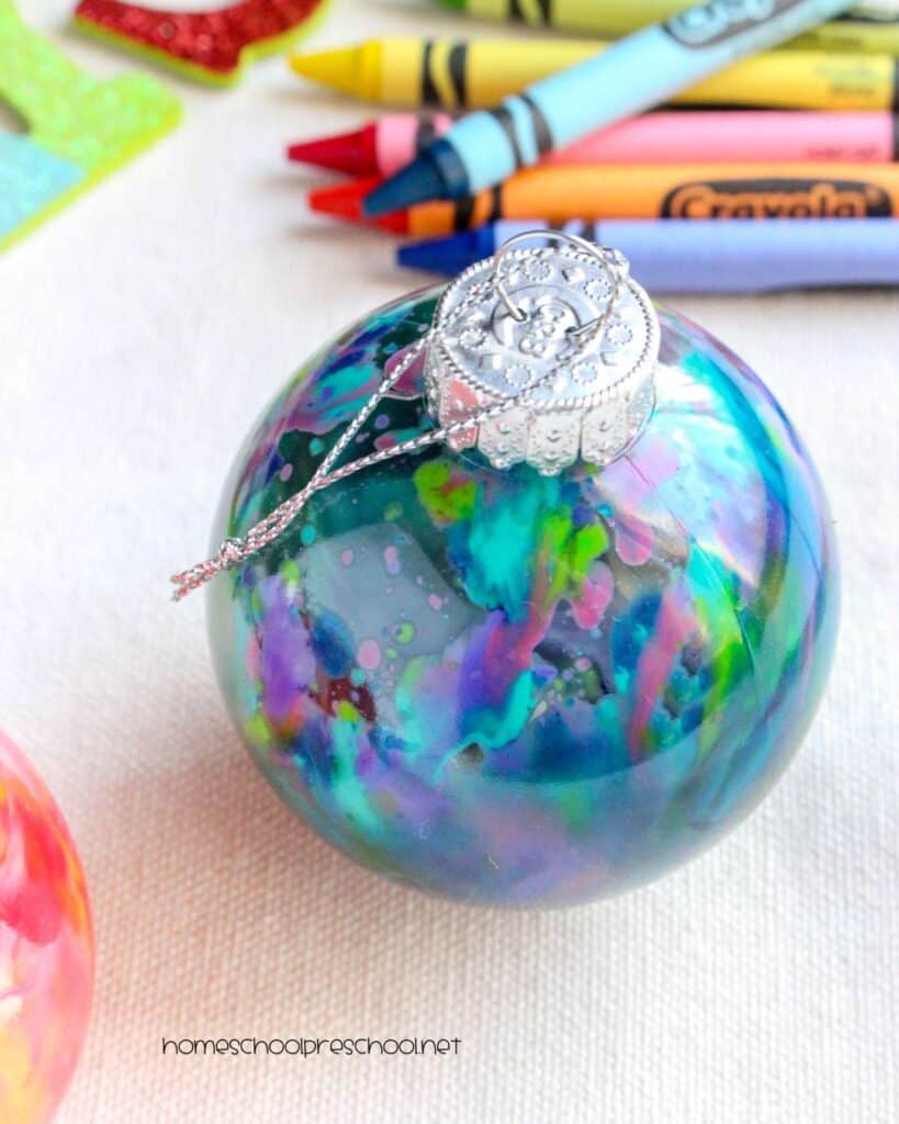 - With an adult's help, use a hairdryer or heat gun to heat the outside of the ornament gently. Rotate the ornament while heating to distribute the melted crayon evenly and create a swirl effect.