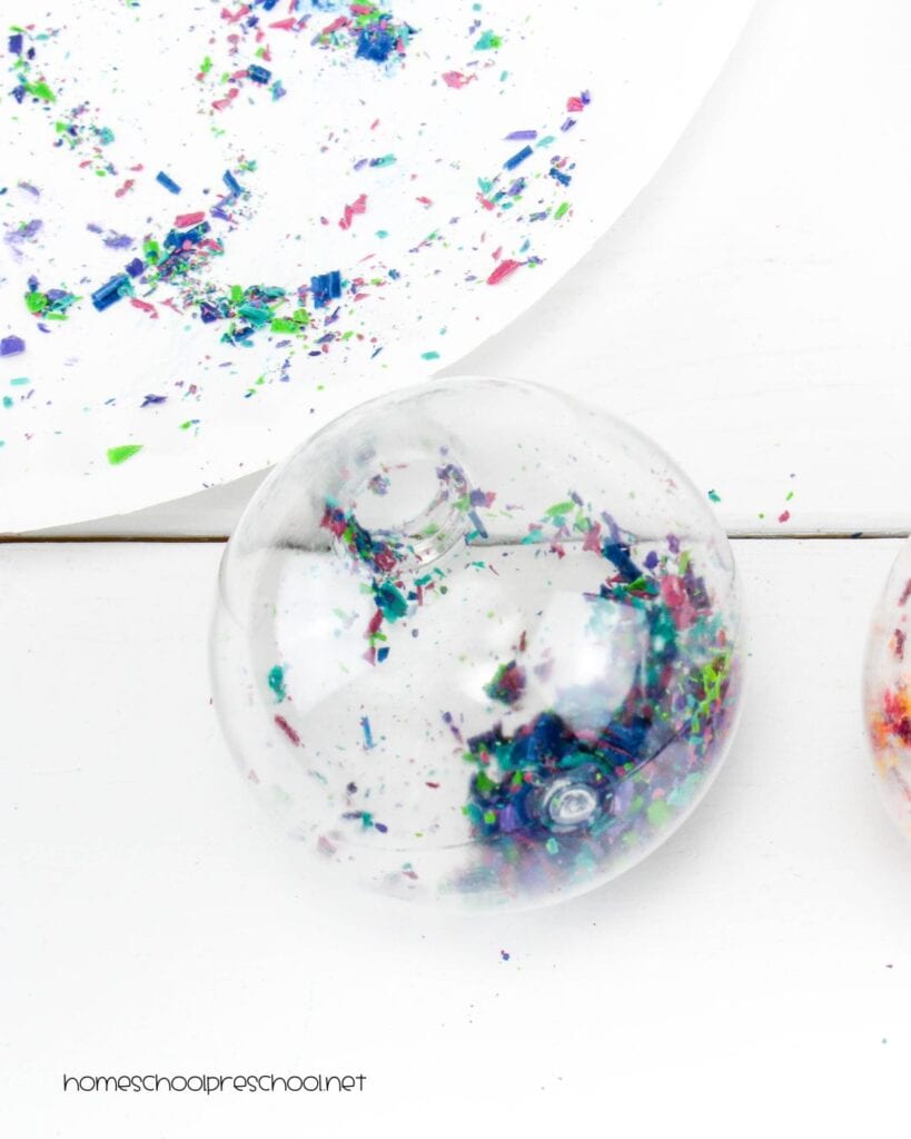 - Open the top of the clear ornament and sprinkle in the crayon shavings. Kids can layer the colors for a fun striped effect or mix them for a more blended look.