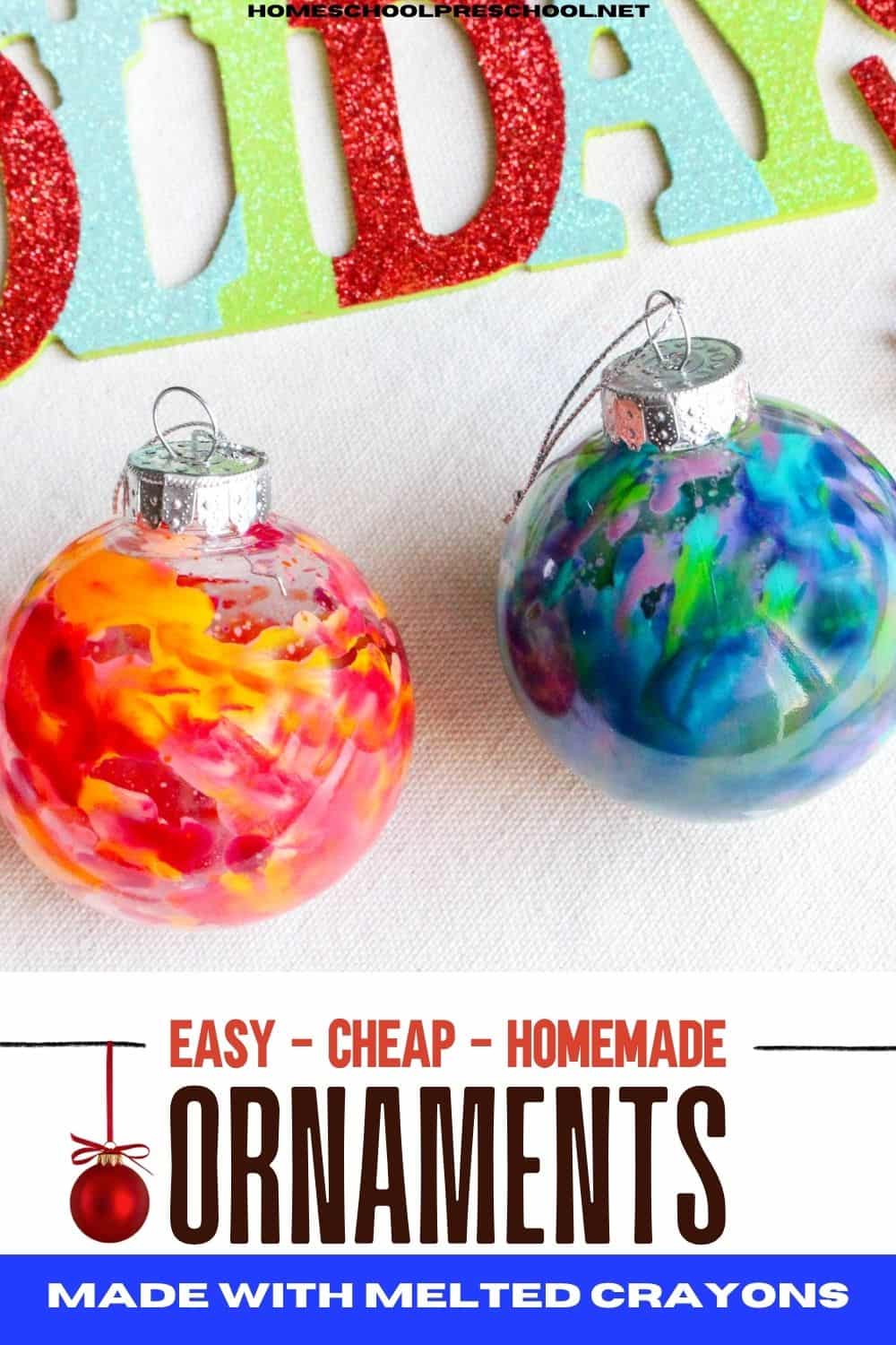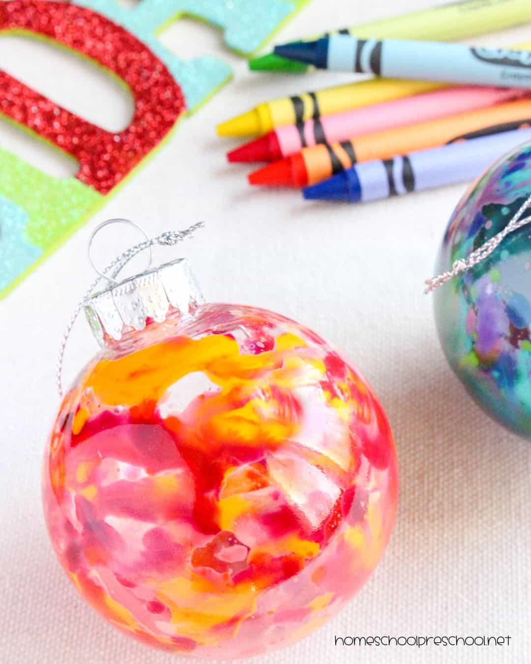You’ll Need: Clear plastic ornaments, broken crayons, hair dryer, craft knife or sharpener, towel or oven mitt