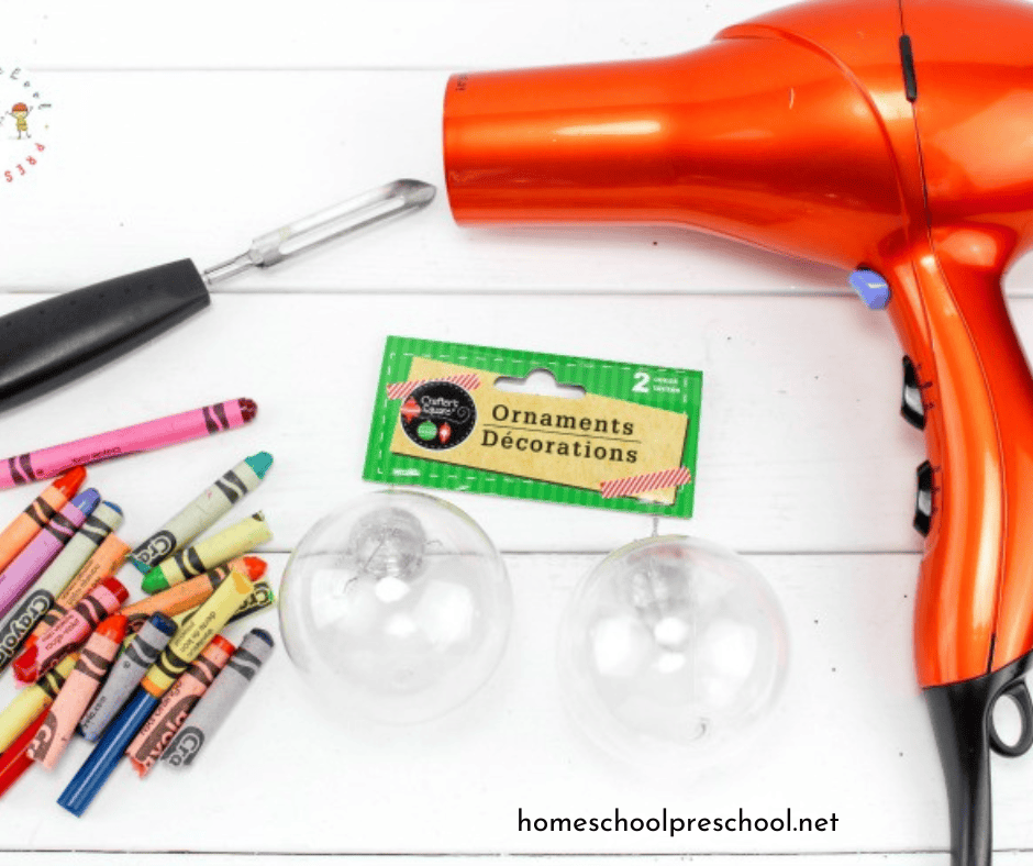 NOTE: For younger kids, I suggest having them control the blow dryer while you maneuver the ornaments. This way, their little fingers won’t get too hot to hold the ornaments.
