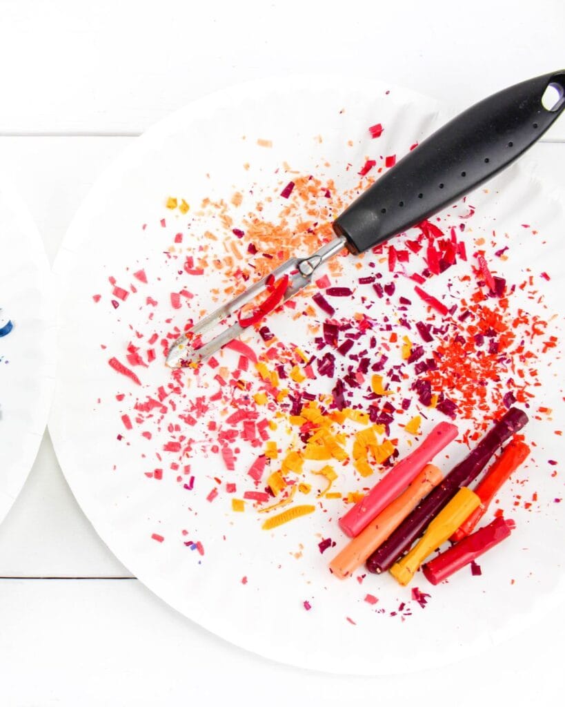 Now, with adult supervision, use a vegetable peeler or cheese grater to scrape some broken crayons. Collect all of the little bits on a paper plate. You’ll need about two teaspoons total of all the colors for each of these easy melted crayon ornaments.
