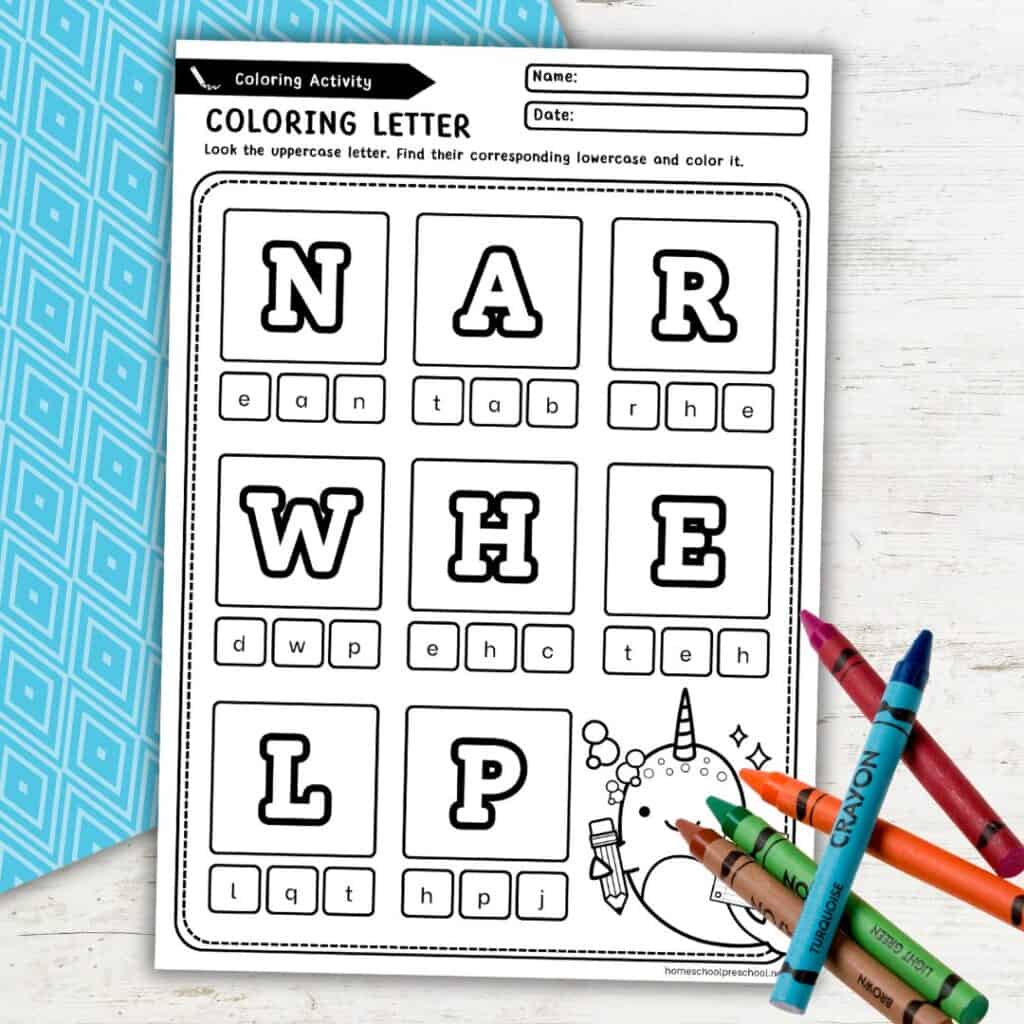 Kids will look at the uppercase letters and find their matching lowercase letters. Once they find the correct match, they color it. This activity helps with letter recognition and reinforces uppercase and lowercase pairings. The fun narwhal theme keeps kids engaged while they learn!