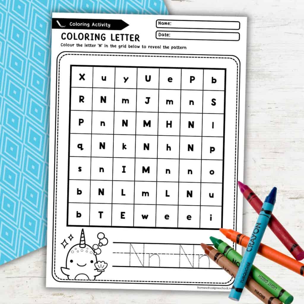 Kids will search for and color every letter “N” in a grid to reveal a hidden pattern. This activity boosts focus and letter recognition.