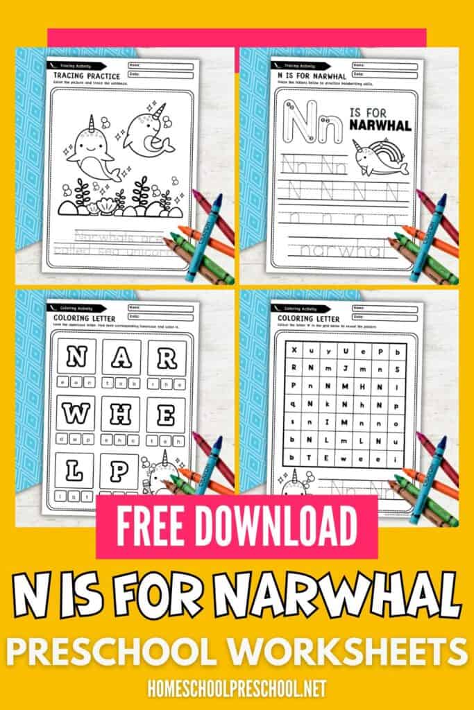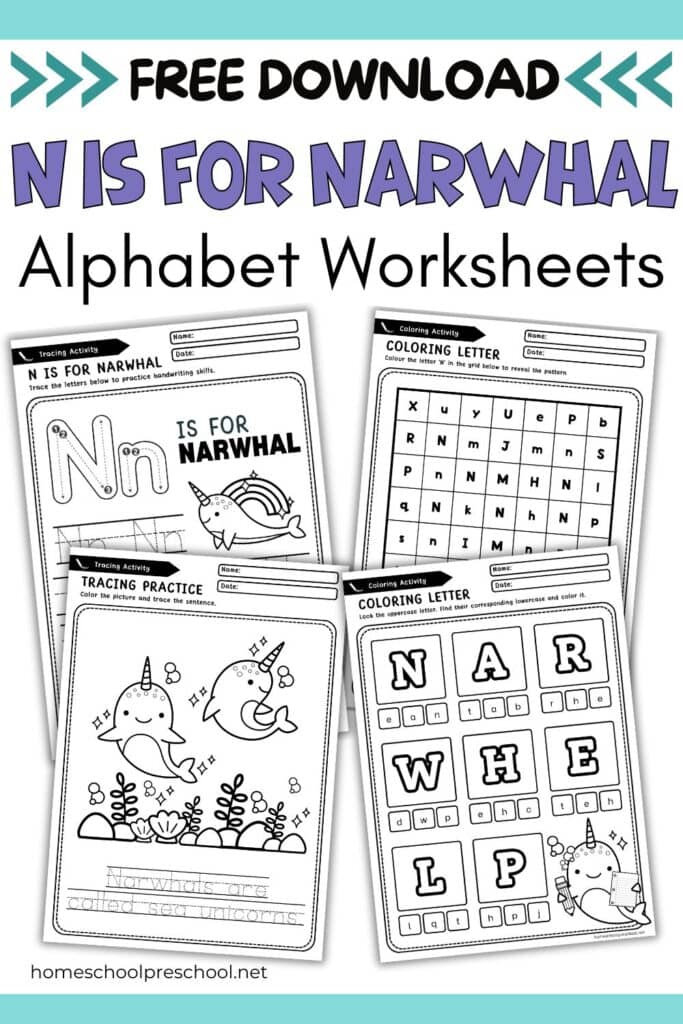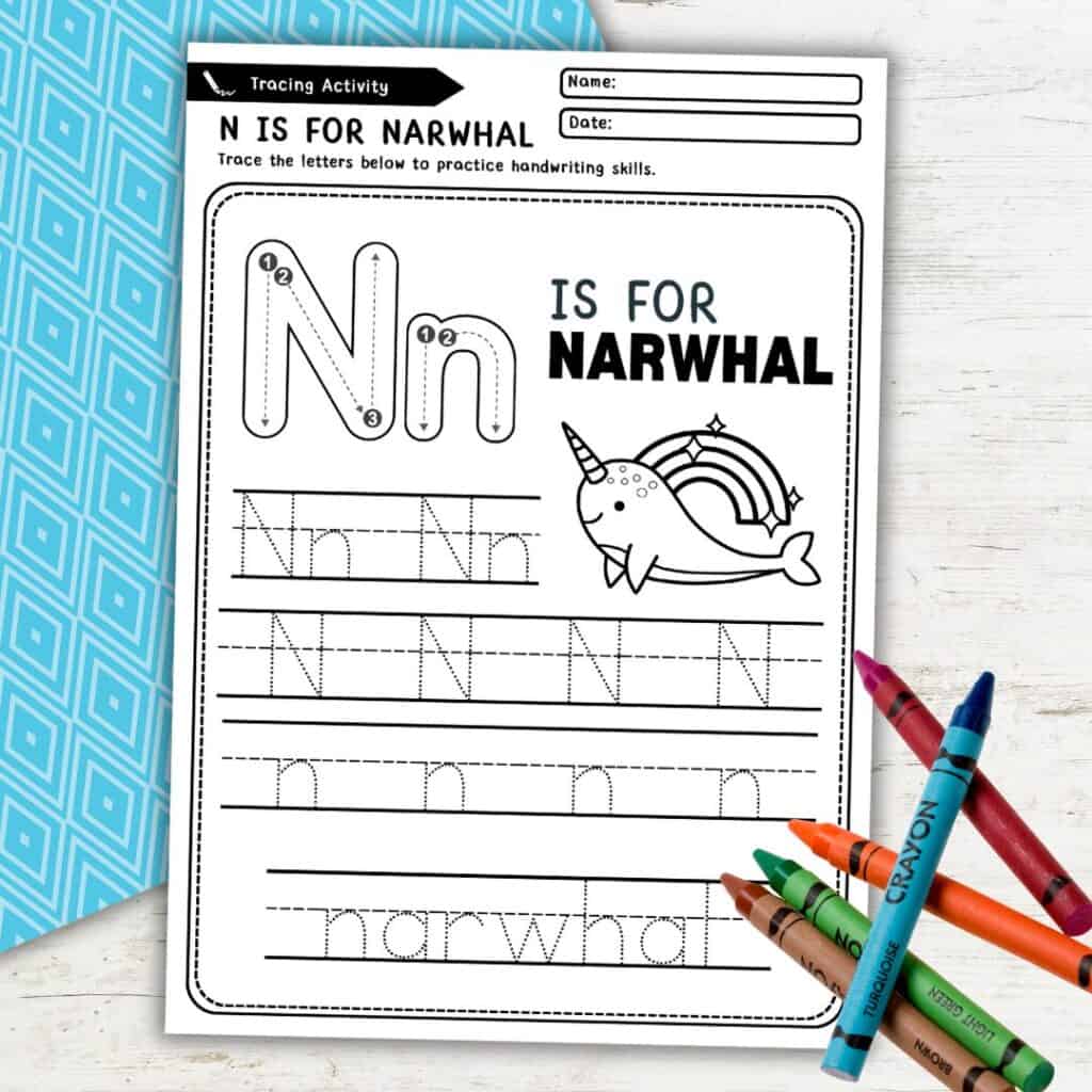 - Tracing Practice: Trace the letter “N” and the word “narwhal” to build handwriting skills.
