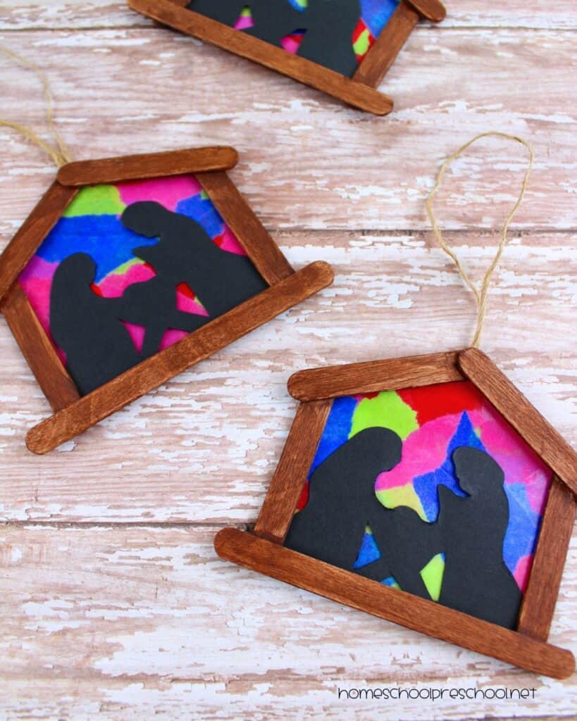 The dark, solid silhouette we create focuses all the attention inward onto the Holy Family. This represents how Mary, Joseph, and the shepherds focused completely on baby Jesus, who was the reason for their hope. Every time your child looks at the ornament, the dark frame helps their eye focus on the light inside.