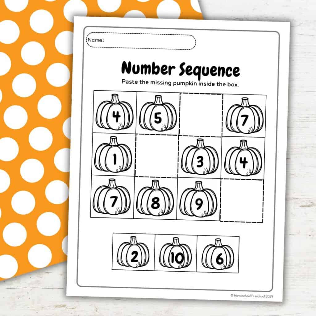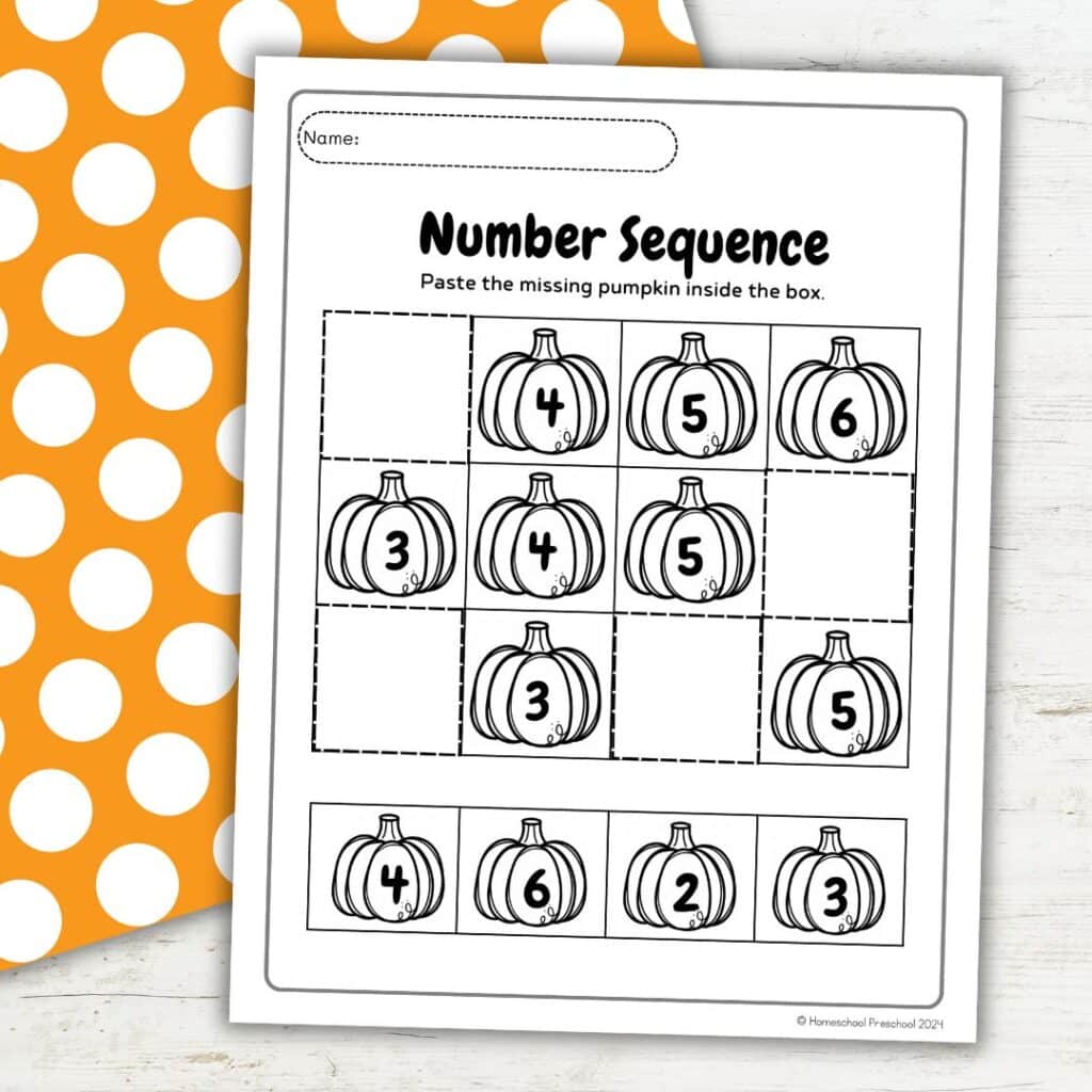 This free fall-themed printable pack includes three engaging worksheets designed to help preschoolers practice number order with a fun pumpkin twist. Each page features a row of numbered pumpkins with one missing. Children will cut out the number pieces at the bottom and paste them into the correct spot to complete the sequence.