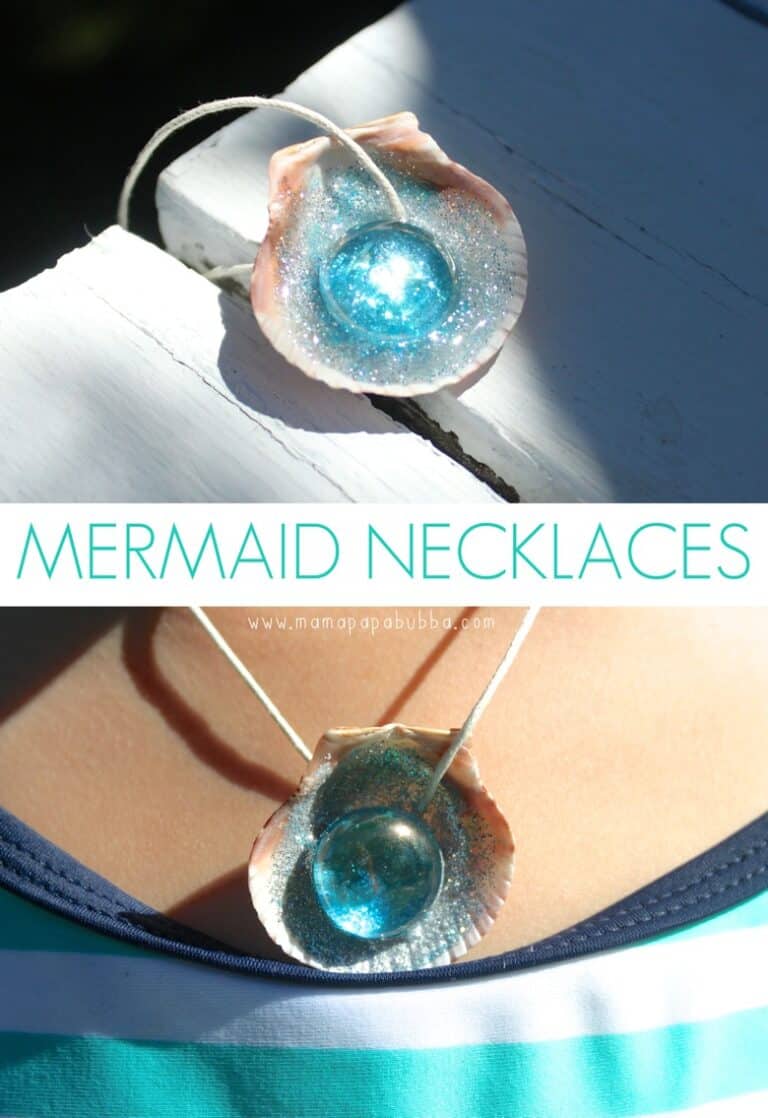 Seashells and glitter glue (and a couple other simple supplies) combine to make a beautiful mermaid necklace your preschoolers will wear all summer long.