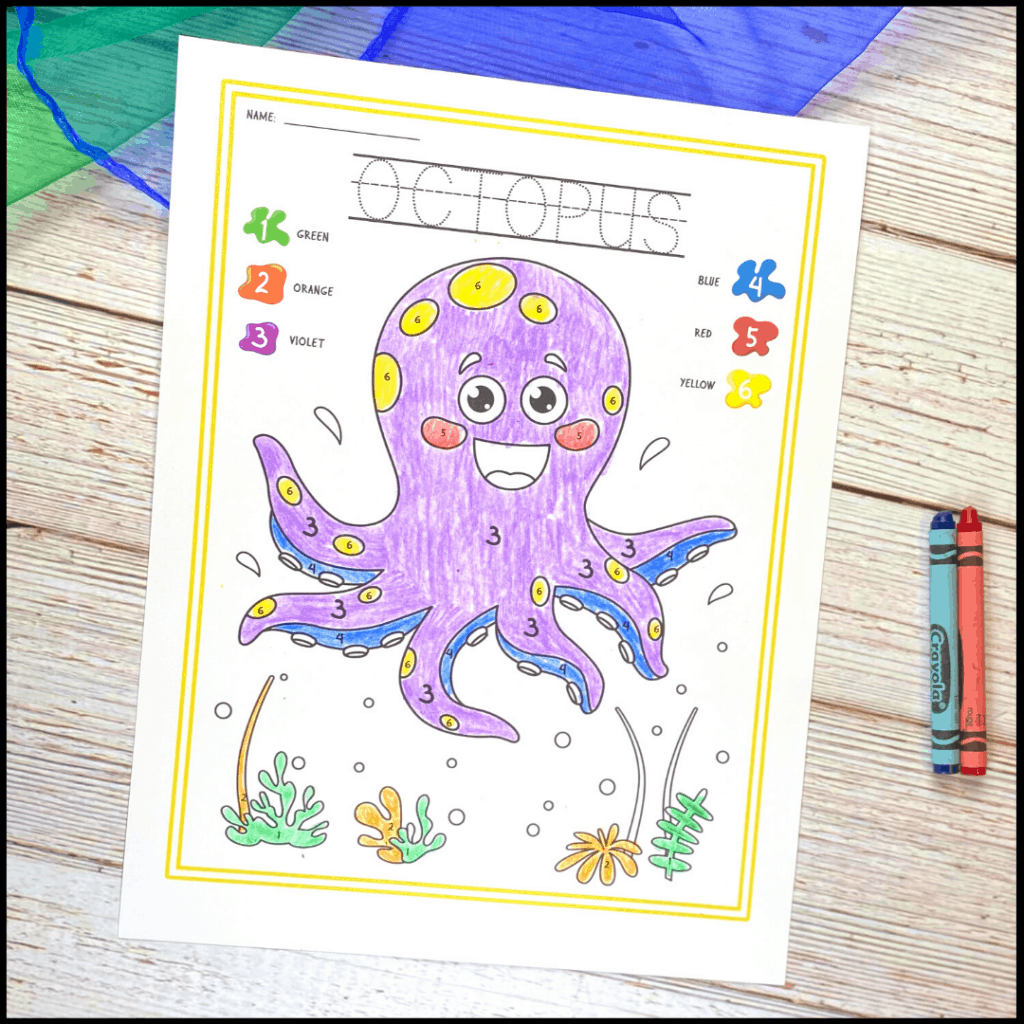 The first page in this page is an octopus color by number page. Kids will work on number recognition (1-6) and color recognition as they complete the activity page.