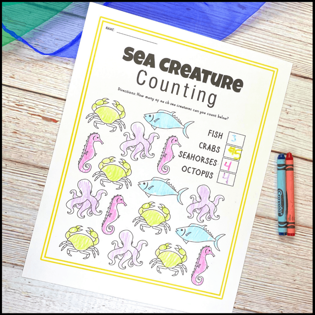 Children will count different types of sea creatures and write the number in the correct box. If they have trouble remembering what they’ve counted, They can color the images as they count them.
