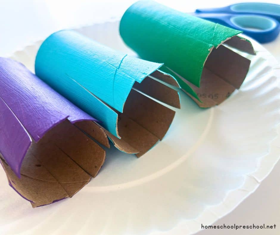Cut slits around the lower half of the toilet paper roll using scissors. Ensure the slits are approximately ½ to 1 inch apart and extend halfway up the roll.