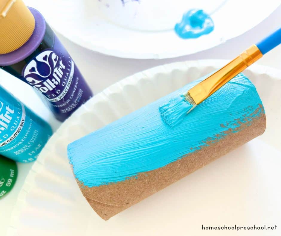 Select a paint color (purple, green, or turquoise) and paint the entire outer surface of a toilet paper roll, ensuring even coverage.