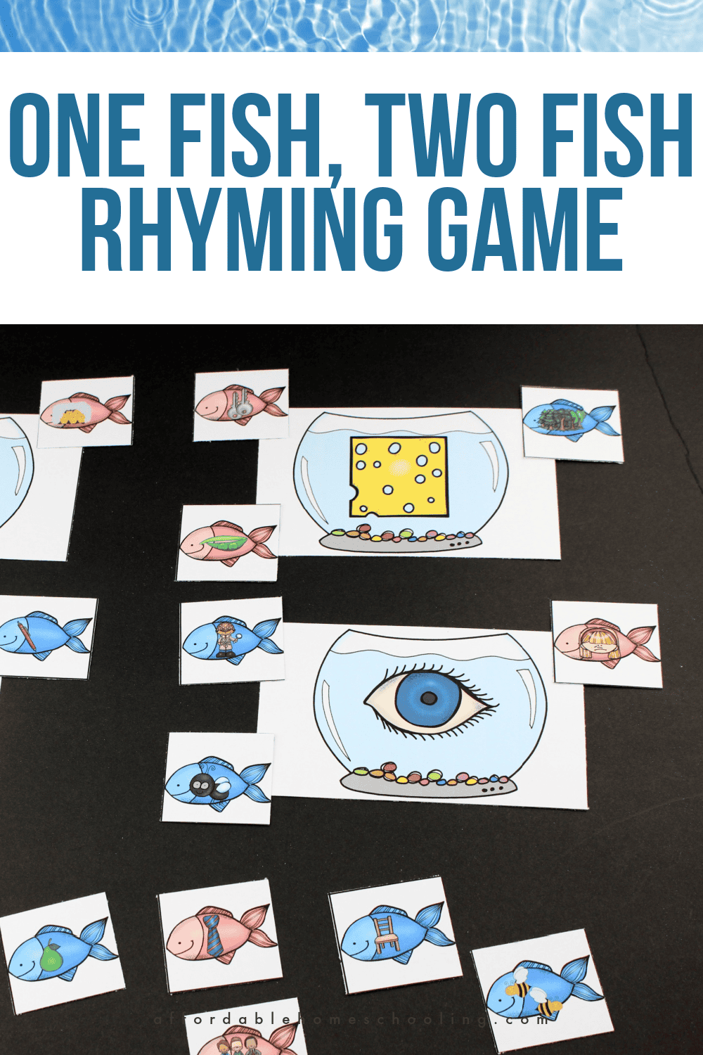 Learners will spread out the fish and fishbowls. It’s up to you to decide how many to play at one time. You could start with one fishbowl mat and 8 rhyming cards for beginning learners. Or, you can lay them all out to challenge your older learners.