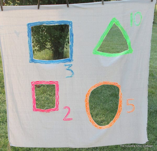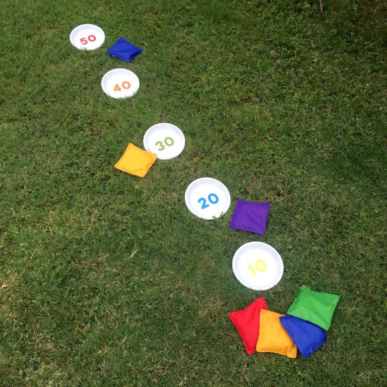 Tossing bean bags into painted clay pot saucers sounds easier than it is. And, if you’re afraid to use clay saucers with little ones, you can use frisbees.