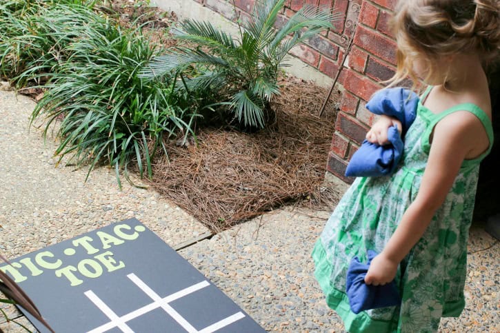 Tossing the bean bags on to the homemade Tic Tac Toe board makes this game a little more challenging than a “normal” game of tic tac toe. Kids are sure to love the challenge!