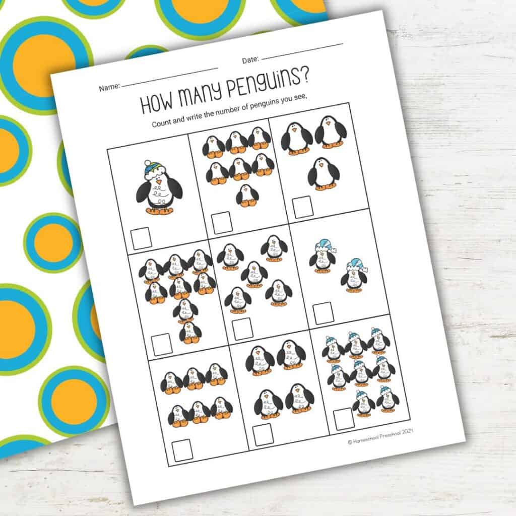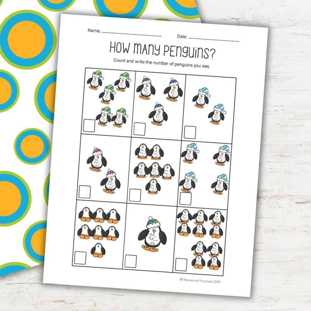 - Place the worksheet on the table and make sure your child can clearly see each group of penguins.
