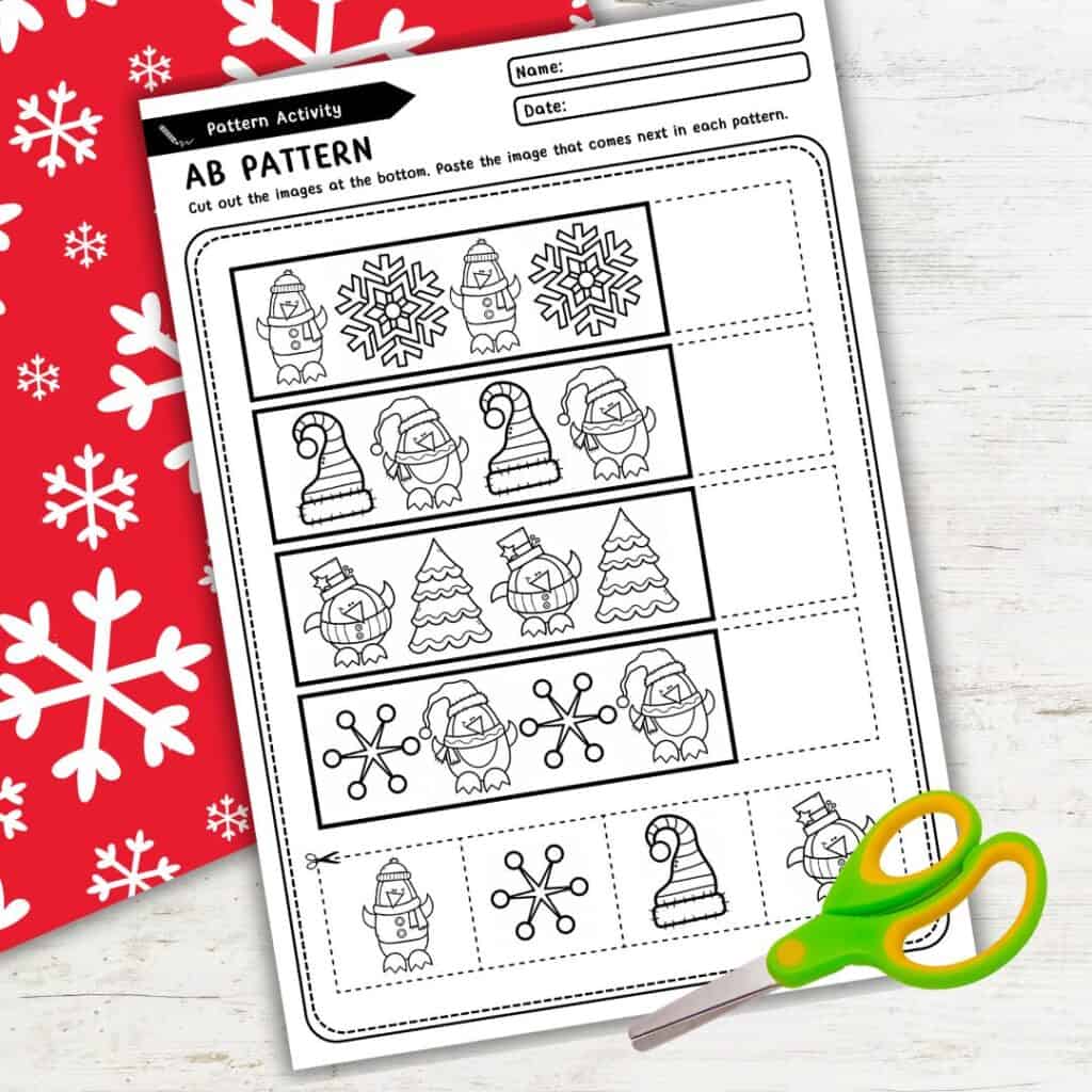 A: It’s super easy! Just print the pages, grab some scissors and glue, and let kids cut and paste the missing pieces to complete each pattern. If you want to reuse them, try laminating the pages and using velcro dots instead of glue.