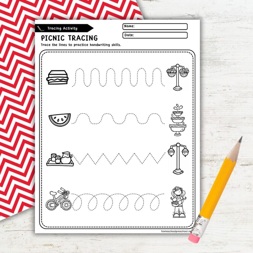 - Picnic Tracing Page – Practice pencil control by tracing fun lines.