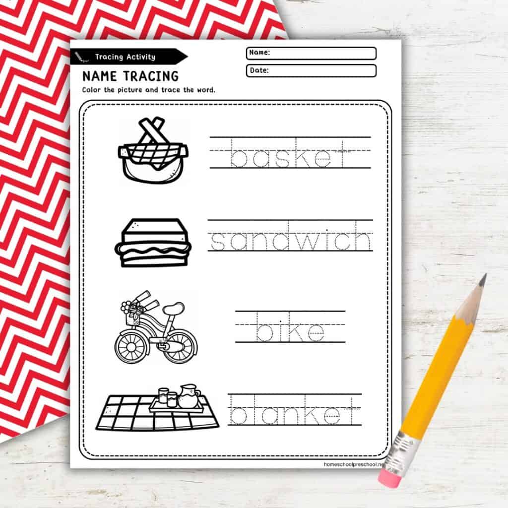 - Name Tracing with Picnic Pictures – Trace simple words like basket, bike, and blanket.