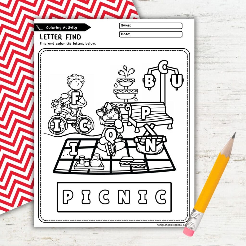 The letter find page is a playful way to help preschoolers practice recognizing letters in both uppercase and lowercase. In this activity, kids search for the letters in the word “PICNIC” and color them as they go. This helps strengthen visual discrimination skills and gives them repeated exposure to important alphabet letters.
