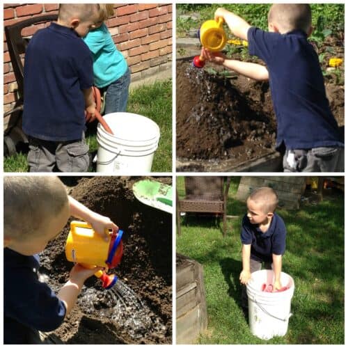 I love the idea of setting up a huge dirt sensory bin in a raised garden bed. This one is half garden-half sensory bin so kids can dig and get messy while watching the life cycle of plants as they do.