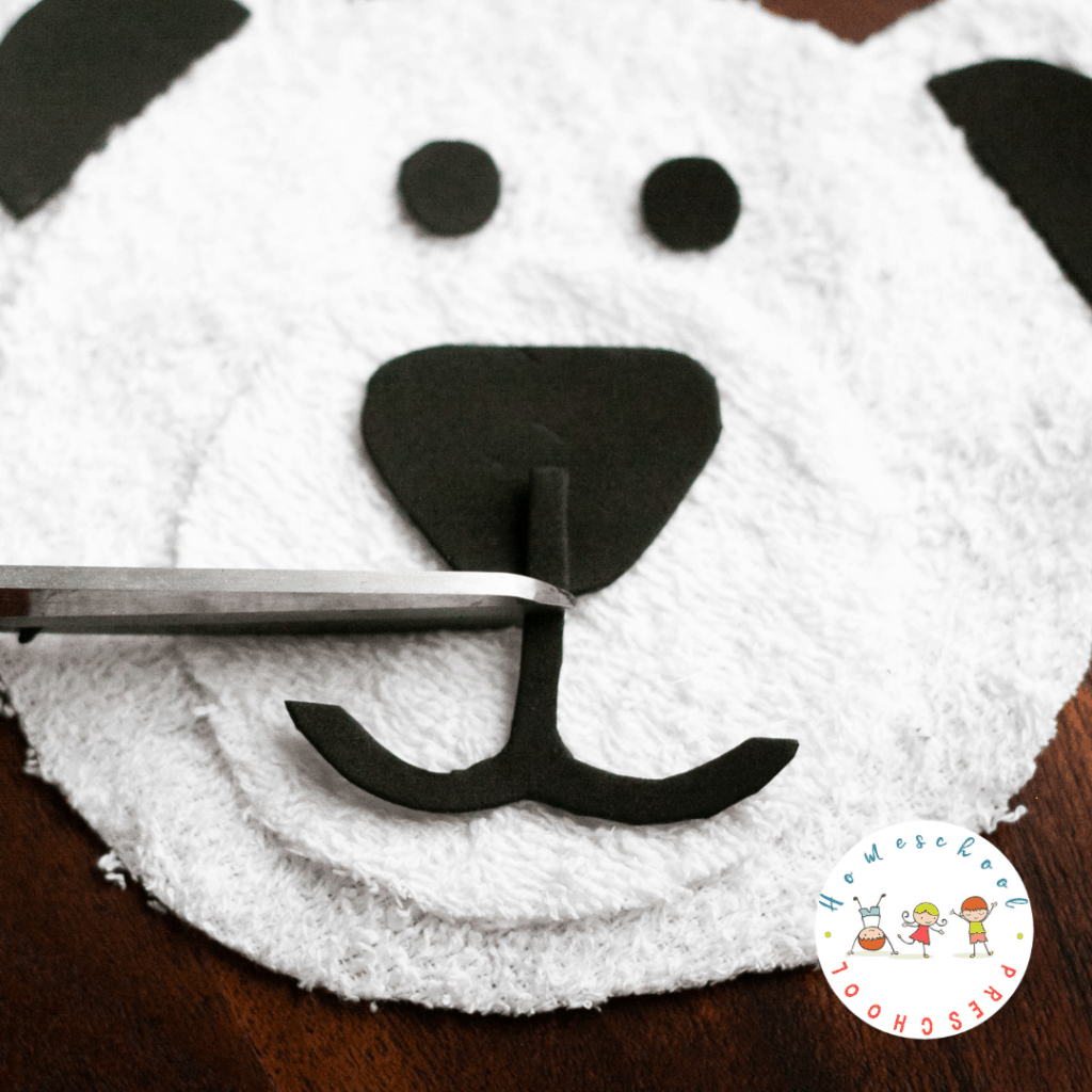- Trace the head, ear (x2), and muzzle on the white washcloth with a black sharpie; cut all pieces out.