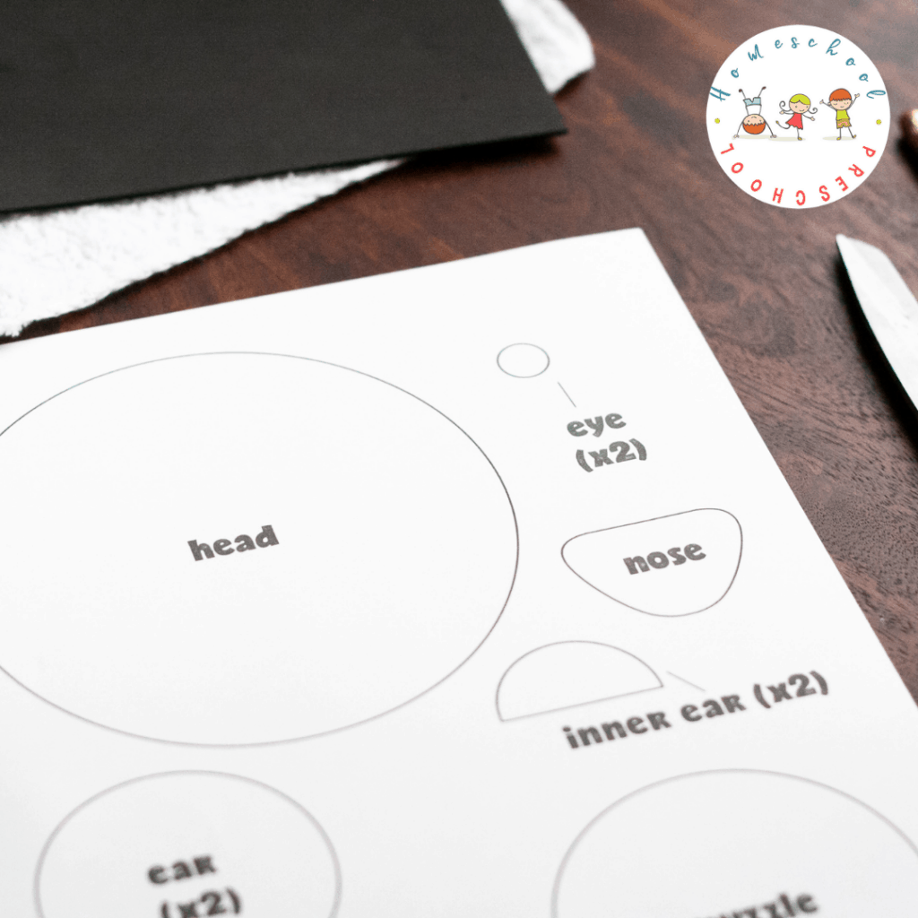 To start, download, print, and cut out the template pieces. Trace the inner ear (x2), eye (x2), nose and mouth on the black foam with a pencil, and then cut out all pieces.