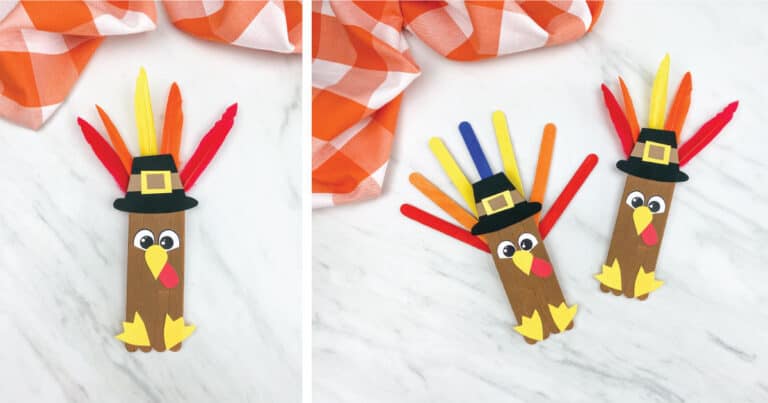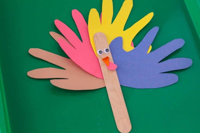 From Life Over C’s comes a sweet and personal Handprint Turkey Puppet that doubles as a keepsake. Children trace and cut out their handprints to form colorful feathers, then attach everything to a craft stick for easy play. This project blends fine motor practice with meaningful holiday fun.