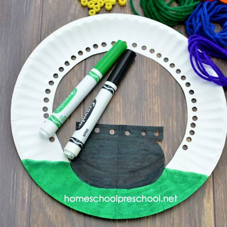 Preschoolers can work on fine motor skills as they create this pot o’ gold paper plate craft for kids. It’s the perfect addition to your St. Patrick’s Day activities.