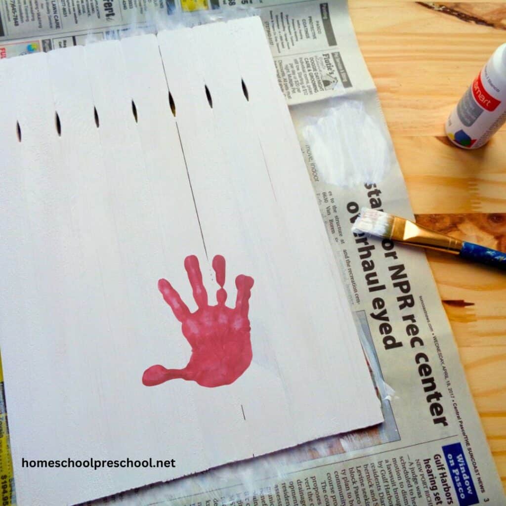 - Create the handprints: Paint your child's hand red (not too much paint!). Gently press it onto one side of the paint stick frame. Lift their hand straight up to avoid smudging.