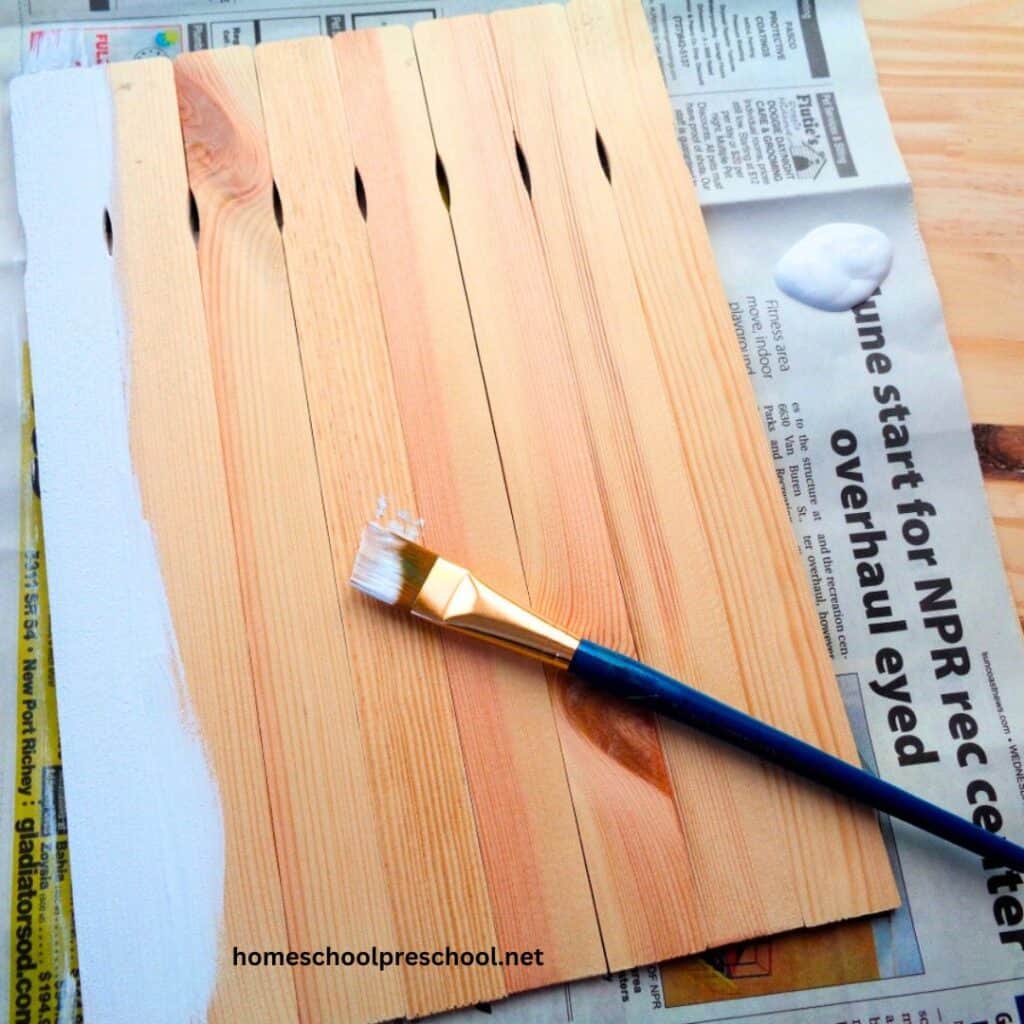 - Paint the frame: Flip the paint sticks over and paint them white with a brush. Add a second coat to cover the wood fully. Let it dry completely.