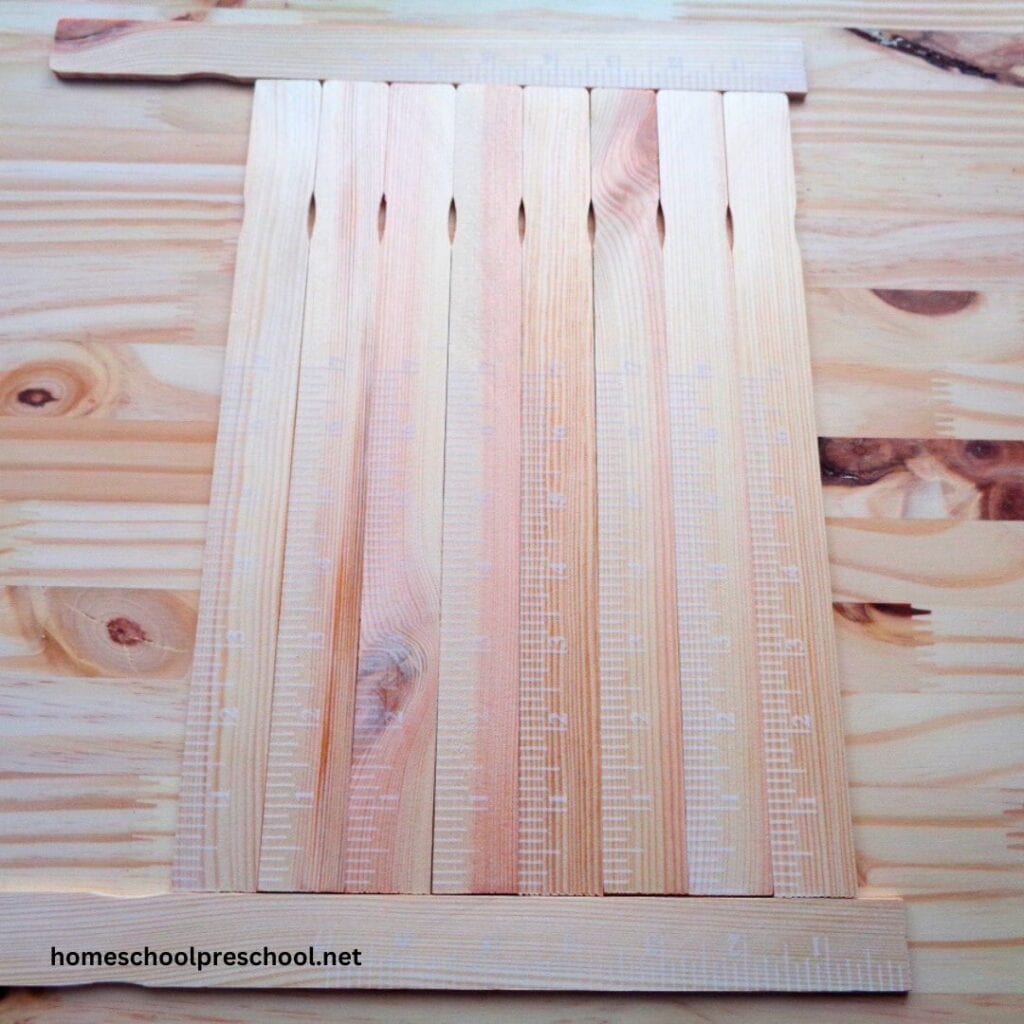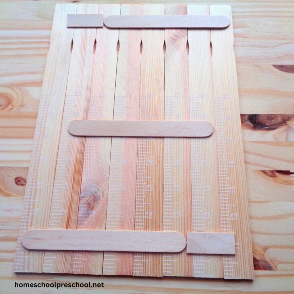 - Make the frame: Line up 8 paint sticks close together. Use 2 on top and bottom to create a straight edge. Glue popsicle sticks across the top, bottom, and middle (you might need to cut a small piece for the top/bottom). This keeps everything sturdy.