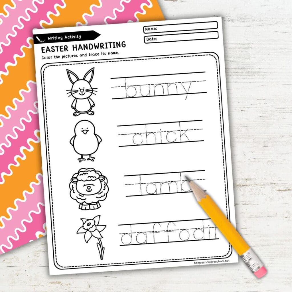 - Handwriting practice – Trace and color Easter-themed words like bunny, lamb, and daffodil.