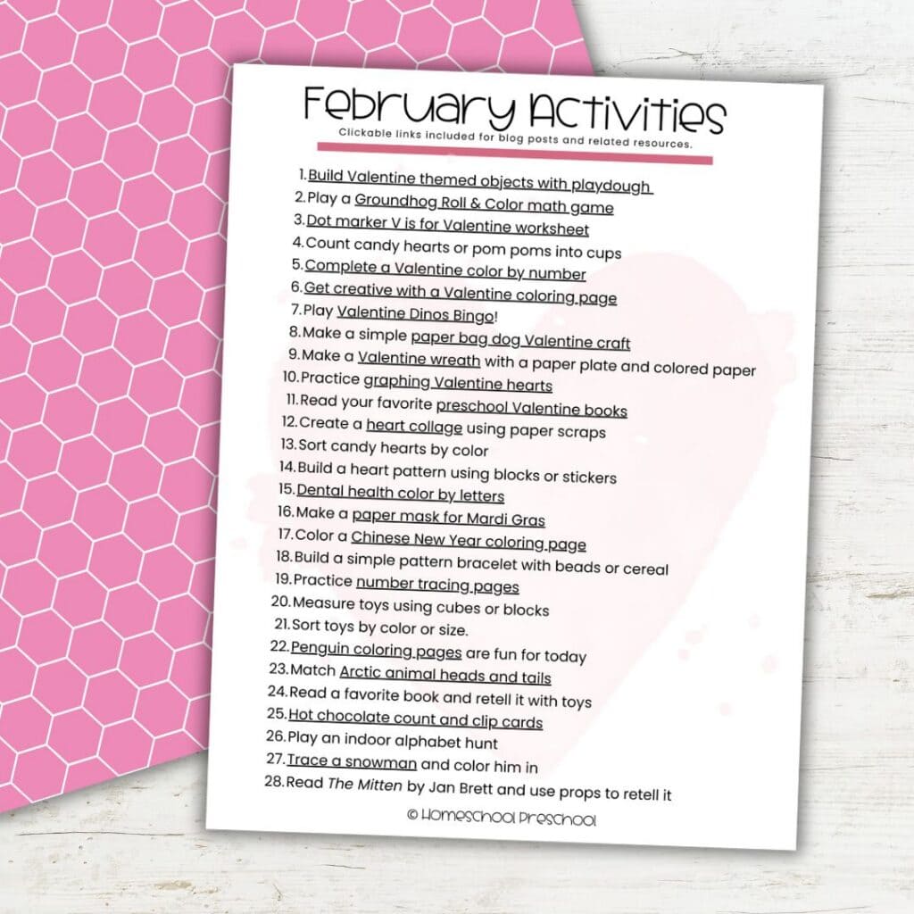 The activity list includes ideas like Valentine-themed playdough builds, counting and sorting activities, coloring pages, simple crafts, early math games, and book-based extensions .