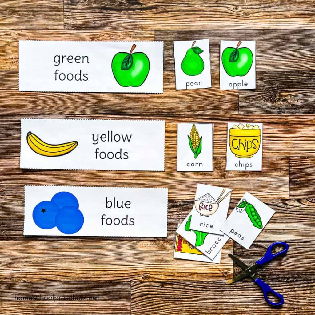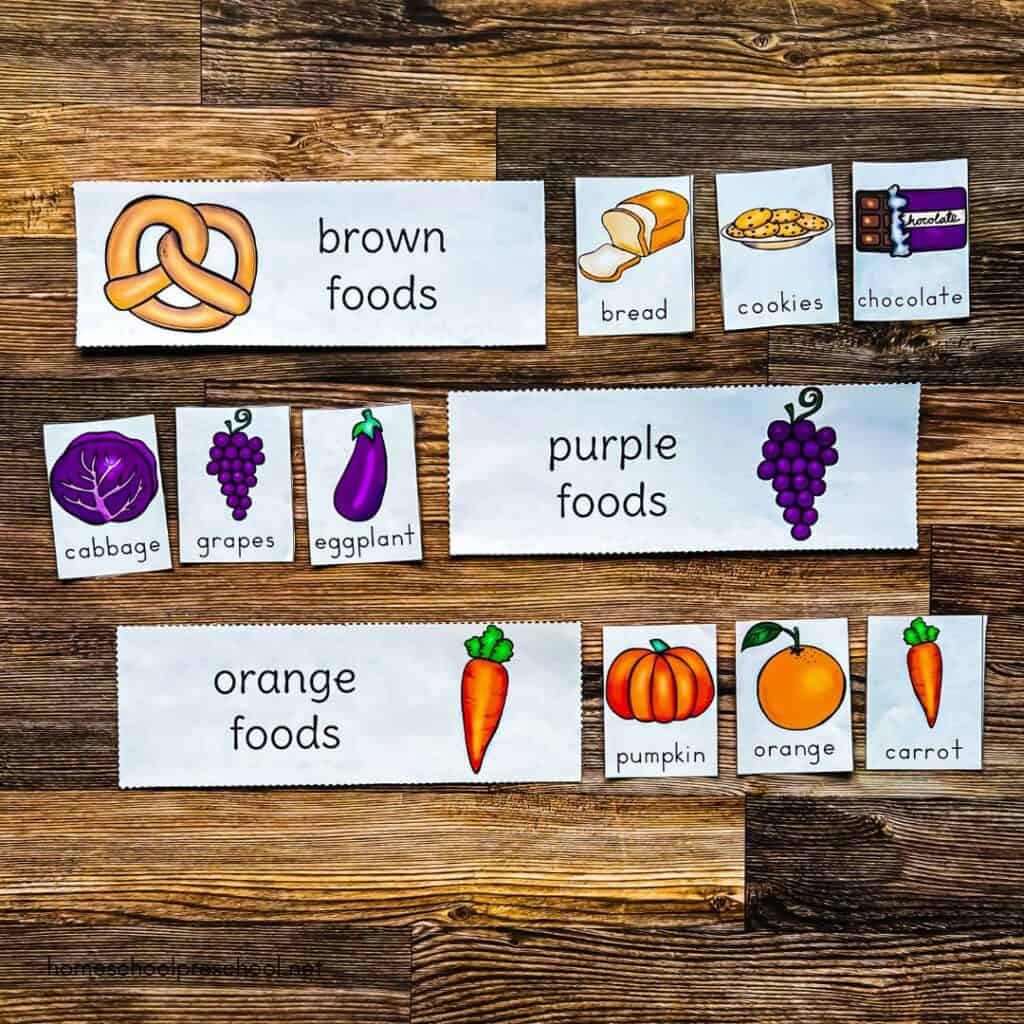 If you are working on colors with your preschooler, this activity is perfect. There are eight labels and 45 food cards. Students will sort the cards under each of the labels – red, orange, yellow, green, blue, purple, white, and brown.
