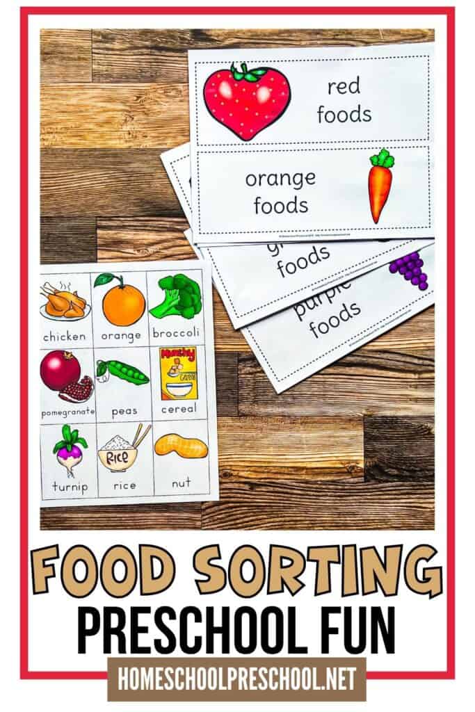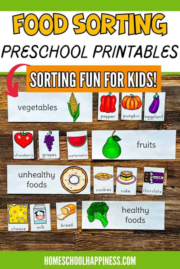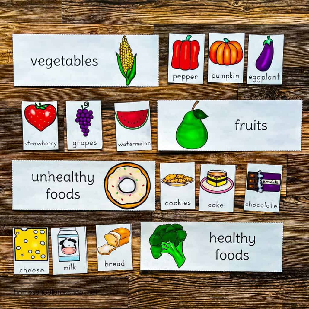 Whether you’re teaching your kids about healthy foods, the four food groups, or nutrition in general, your preschoolers will enjoy this food sorting activity.