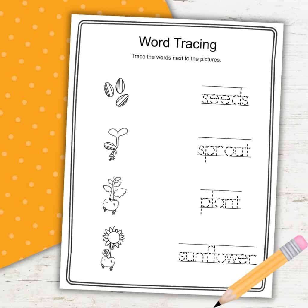 This page gives kids the chance to trace the words: seeds, sprout, plant, and sunflower.