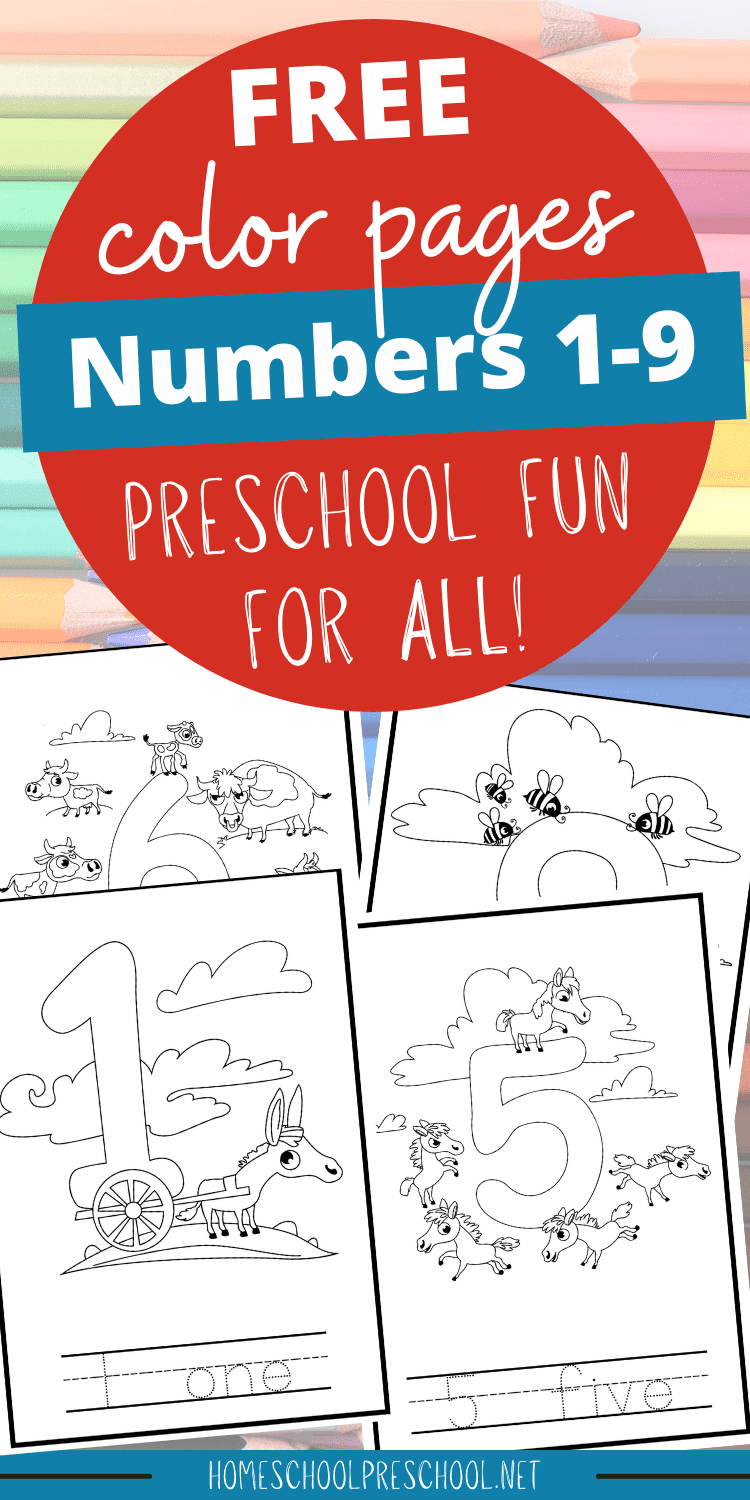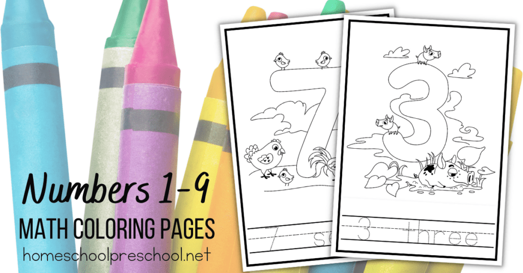 These preschool math coloring pages provide preschoolers with an opportunity to practice number recognition and counting 1-9.