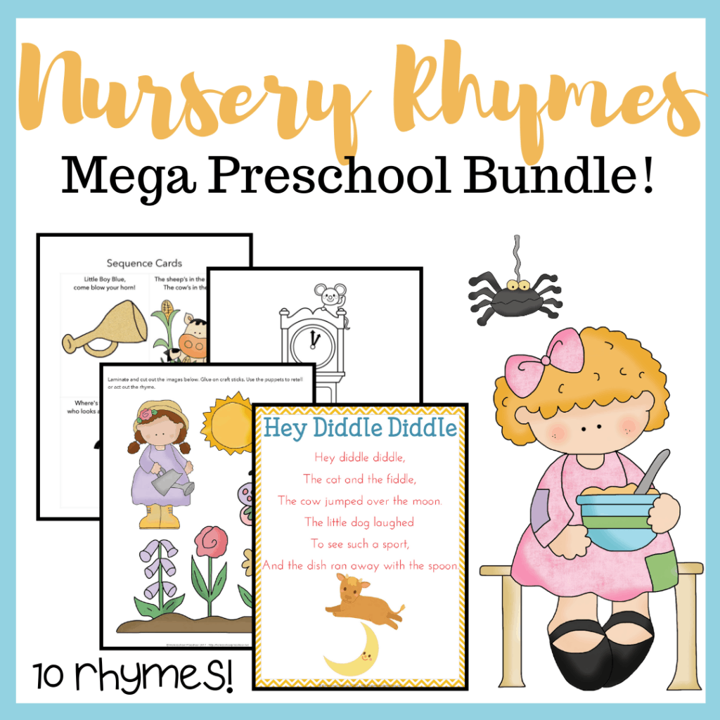 This bundle of nursery rhyme activities features ten rhymes. Each rhyme features a printable poster and nine activity pages. Featured rhymes include: