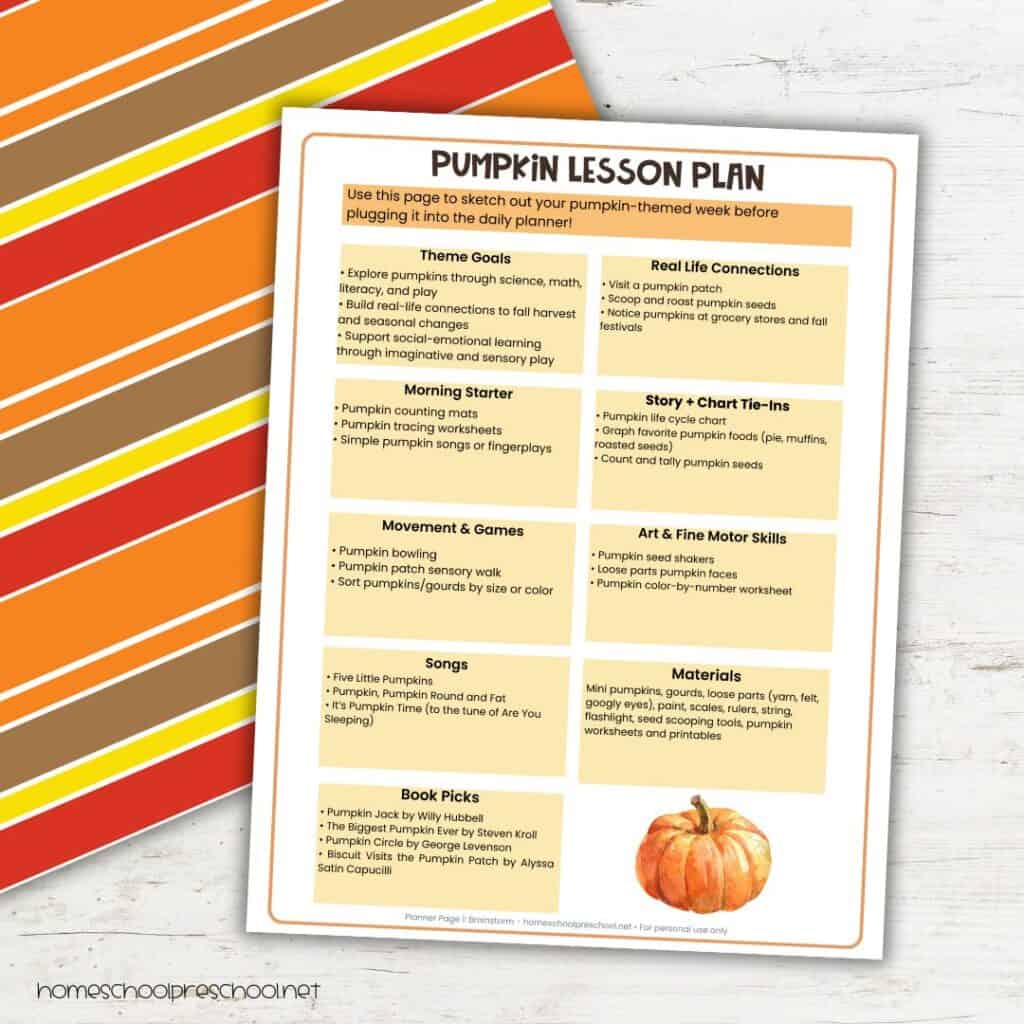 Ready to dive in? Grab my free pumpkin lesson plans for preschool to kick off your theme with a splash! You can find the planner at the bottom of the post.